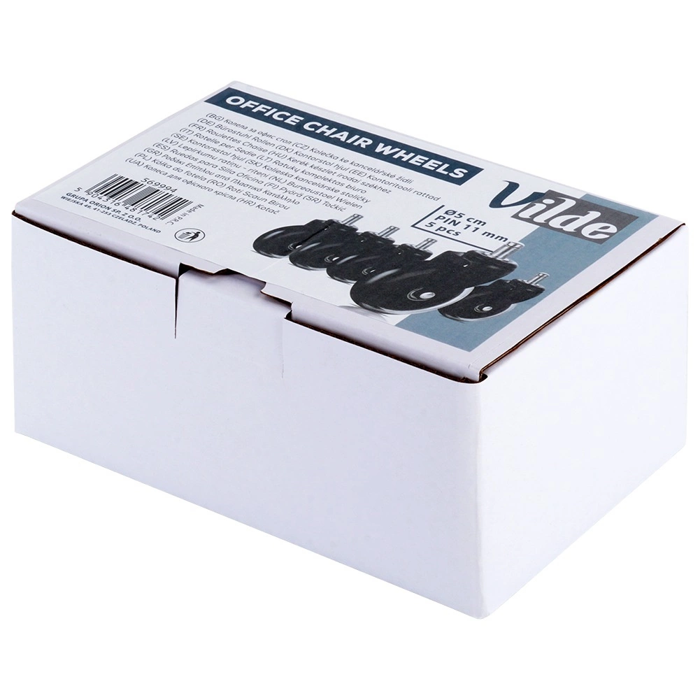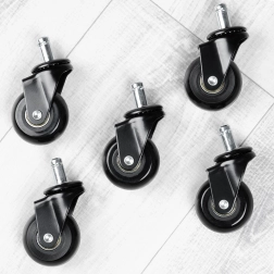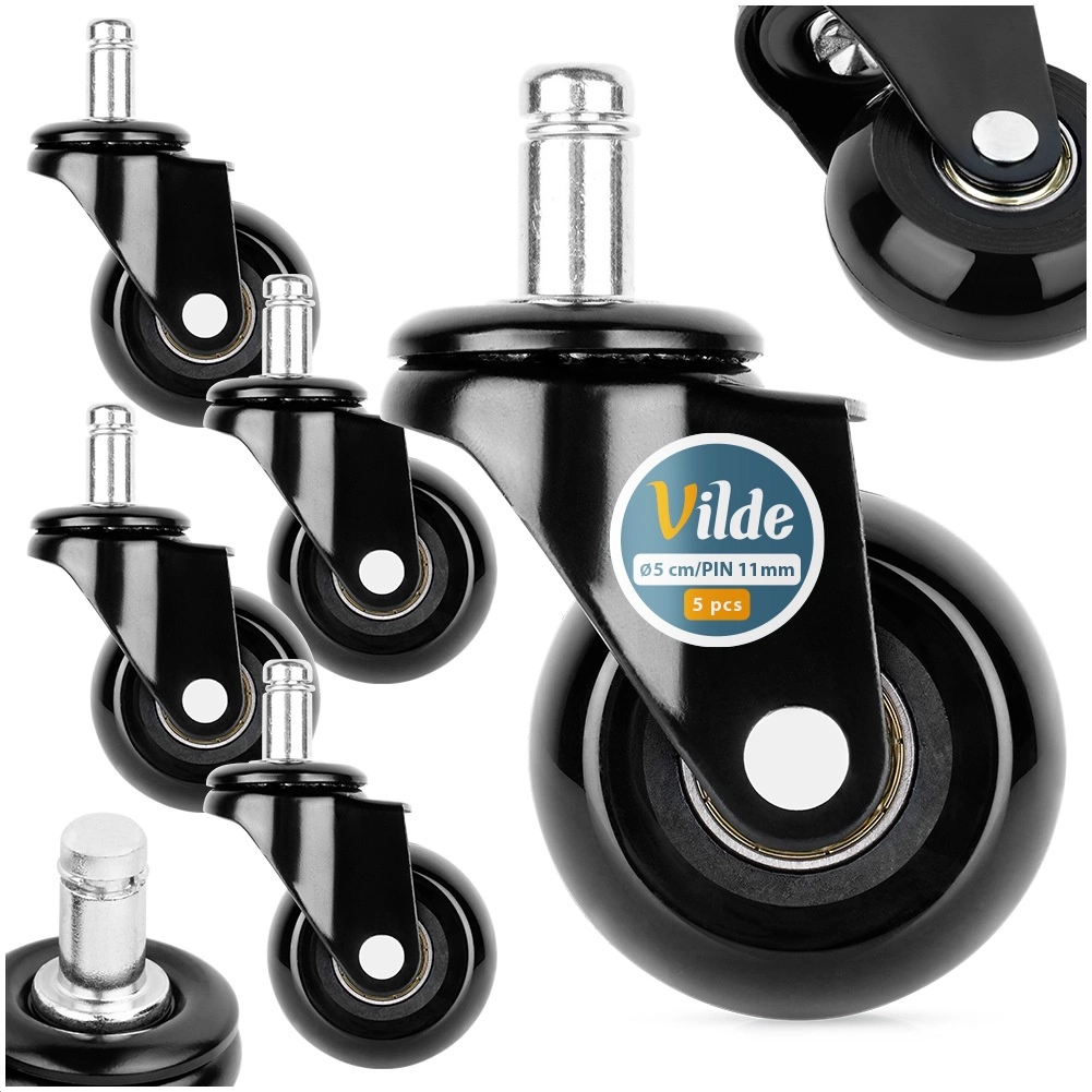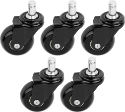 Set de rezervă cu cinci rotițe pentru scaune de birou, cu montaj ușor fără unelte. Rotițele din cauciuc asigură deplasare silențioasă și lină, protejează pardoseala împotriva zgârieturilor și au ax universal de 11 mm. Potrivite pentru majoritatea scaunelor, ideale pentru pardoseli dure.