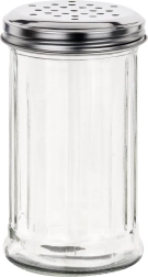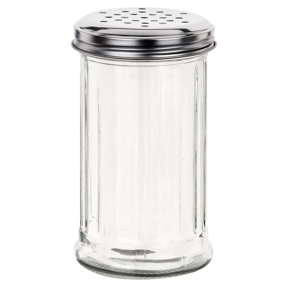 Recipient practic din sticlă cu volum de 350 ml, prevăzut cu capac din inox cu orificii pentru dozare comodă și controlată. Fabricat din sticlă groasă, rezistentă, transparentă pentru verificarea ușoară a conținutului. Ideal pentru sare, piper, ierburi sau zahăr, potrivit pentru uz casnic și în gastronomie și compatibil cu mașina de spălat vase.