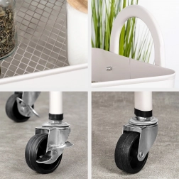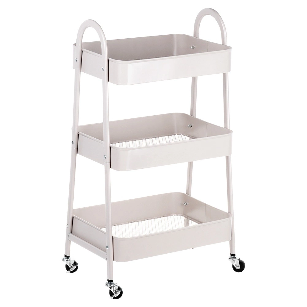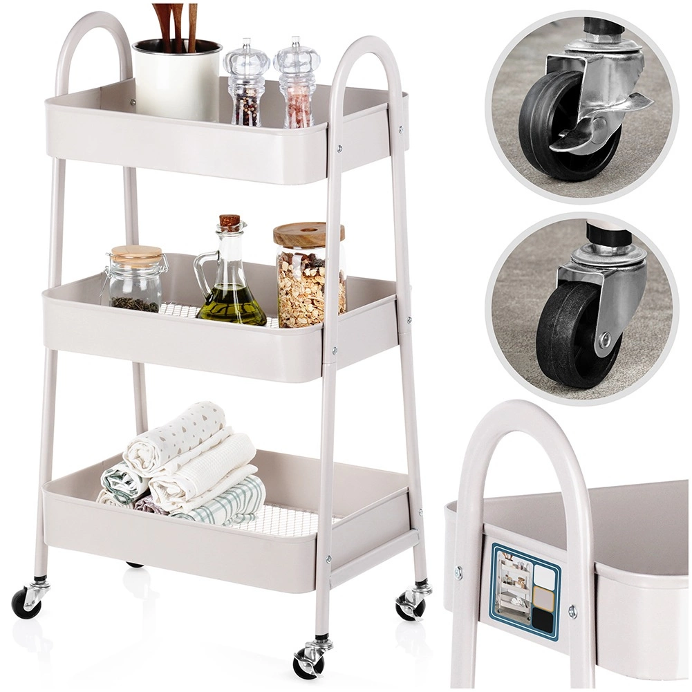 Raft mobil practic și stilat, cu trei polițe spațioase, oferă o soluție inteligentă pentru organizarea casei. Datorită dimensiunilor compacte de 44 × 31,5 × 78,5 cm încape și în spații mai mici, oferind totuși o capacitate mare. Construcția metalică stabilă în culoare bej și 4 roți (2 cu frână) asigură manevrare ușoară și staționare sigură. Ideal pentru bucătărie, baie, birou și atelier.