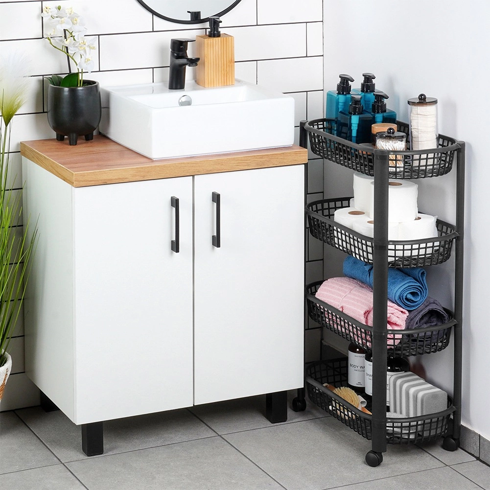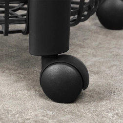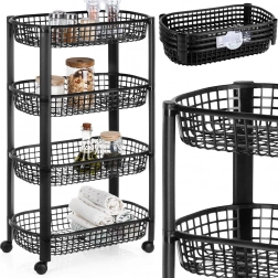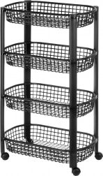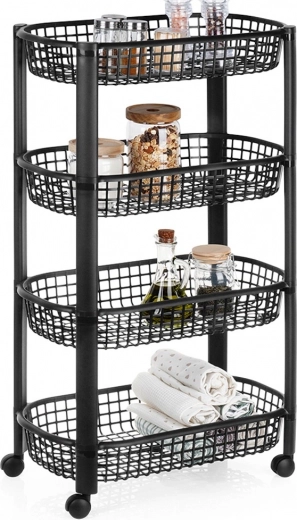 Maximizează spațiul de depozitare pe o suprafață mică. Acest raft suplu, cu dimensiunile 46,5 × 26 × 79 cm, are patru coșuri practice (46,5 × 26 × 7,5 cm) care, datorită structurii deschise tip grilaj, oferă vizibilitate și circulație a aerului. Datorită celor patru roți, căruciorul se poate muta ușor între încăperi; două roți au frână pentru o fixare sigură pe loc.