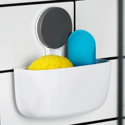 Forma deschisă cu margine superioară rotunjită asigură acces ușor la burete, perie sau cosmetice direct în duș.
