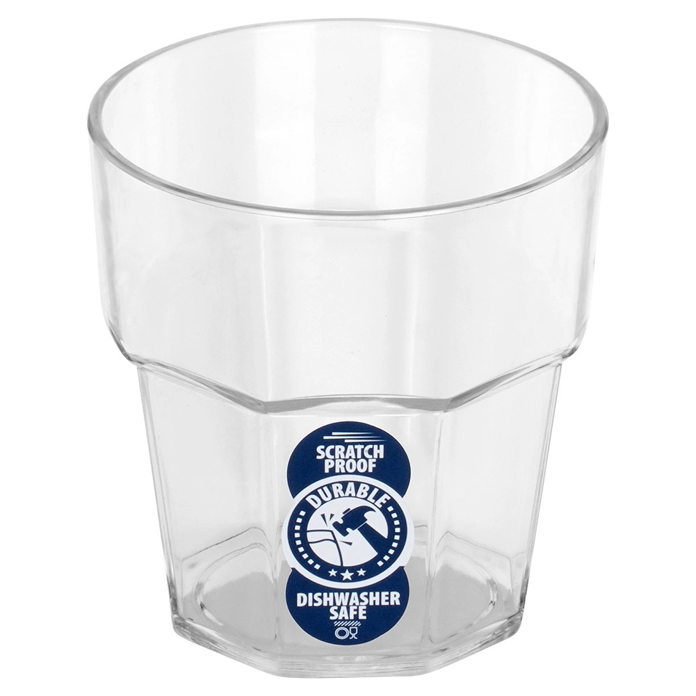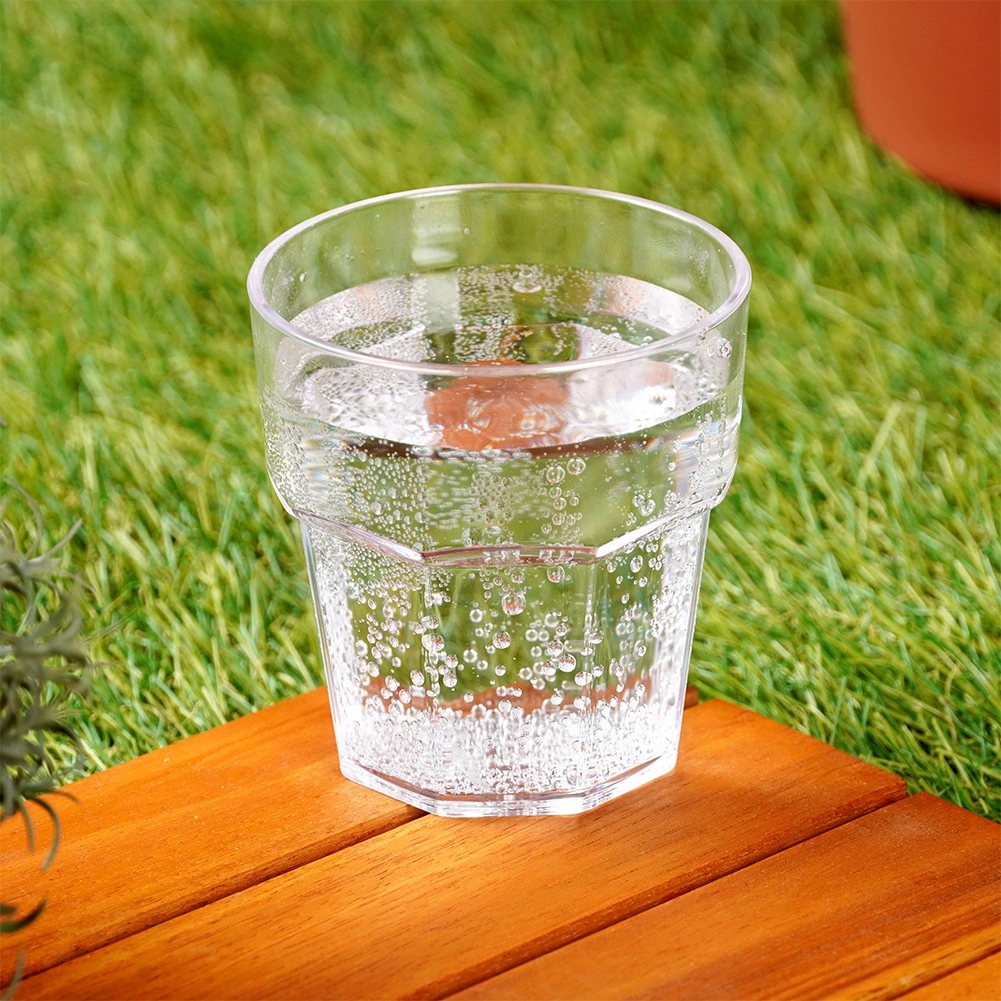 Pahar practic de 275 ml, cu înălțime de aprox. 8,5 cm și diametru de 8 cm, realizat din acril transparent de calitate. Oferă un aspect elegant precum sticla, dar cu avantajul unei rezistențe sporite la spargere. Potrivit pentru apă, limonadă, sucuri, băuturi mixte și ceai rece.
