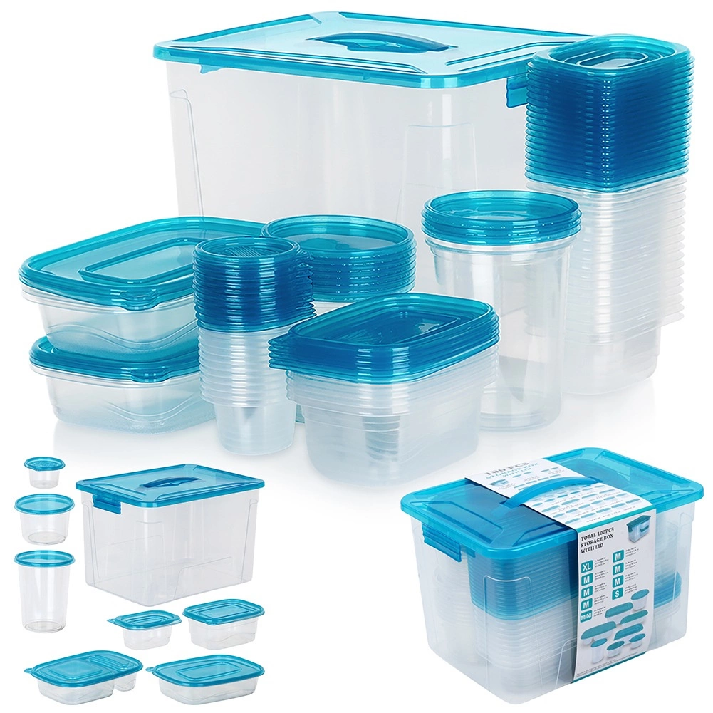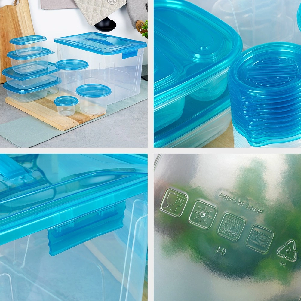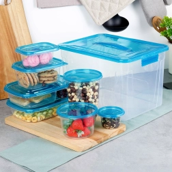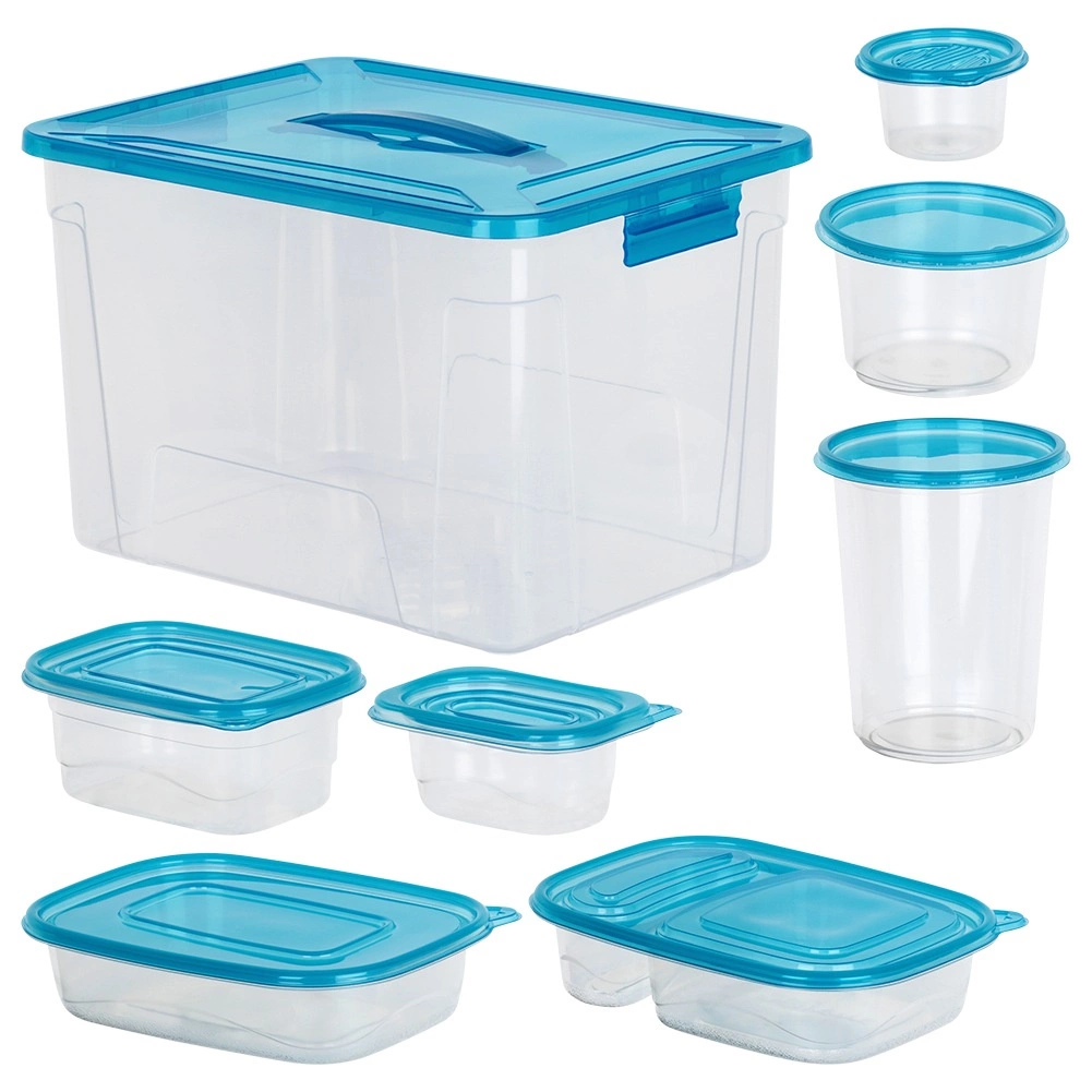 Set practic de recipiente transparente pentru alimente, cu capace albastre, în nouă dimensiuni pentru utilizare zilnică. Închidere etanșă pentru a păstra mâncarea proaspătă mai mult timp, design stivuibil și inserabil pentru economie de spațiu și un cutie mare cu mâner pentru depozitarea ușoară a întregului set. Recipiente sigure pentru alimente, potrivite pentru frigider, congelator, mașină de spălat vase și cuptor cu microunde (încălzire fără capac).