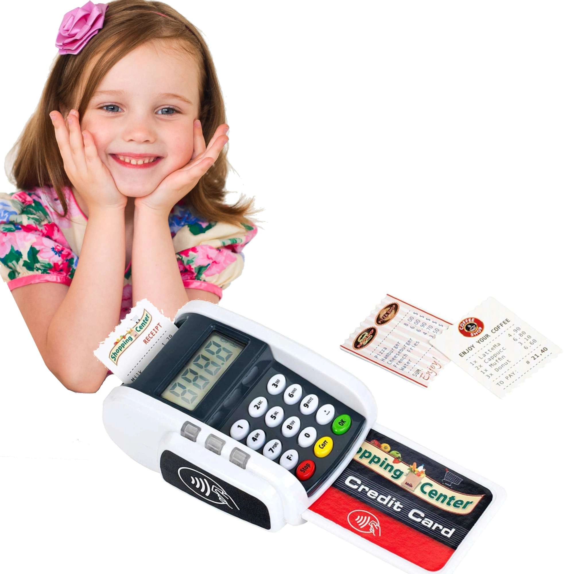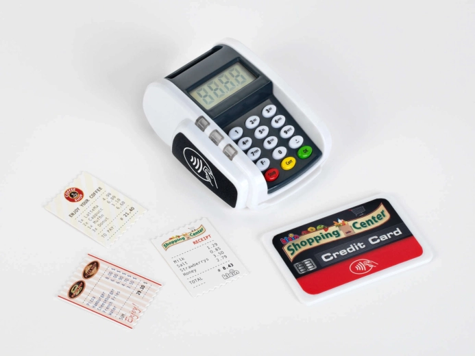 Copiii pot exersa apropierea cardului și apăsarea tastaturii – ideal pentru jocul de-a casierul.