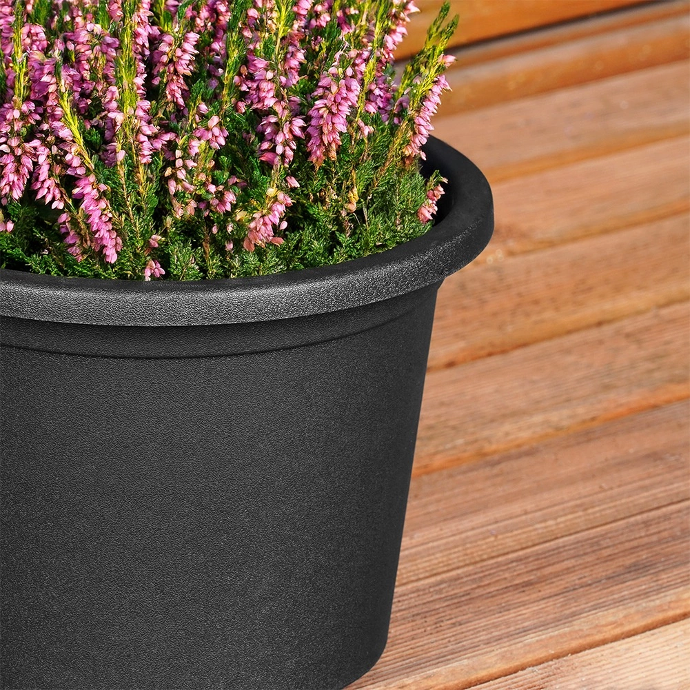Suprafața neagră evidențiază culorile plantelor și oferă utilizare universală la ușa de intrare, pe terasă, balcon și în grădină. Materialul este 90% reciclat, iar ghiveciul este complet reciclabil, ceea ce îl face o alegere ecologică. Întreținere ușoară – murdăria se clătește simplu cu apă.