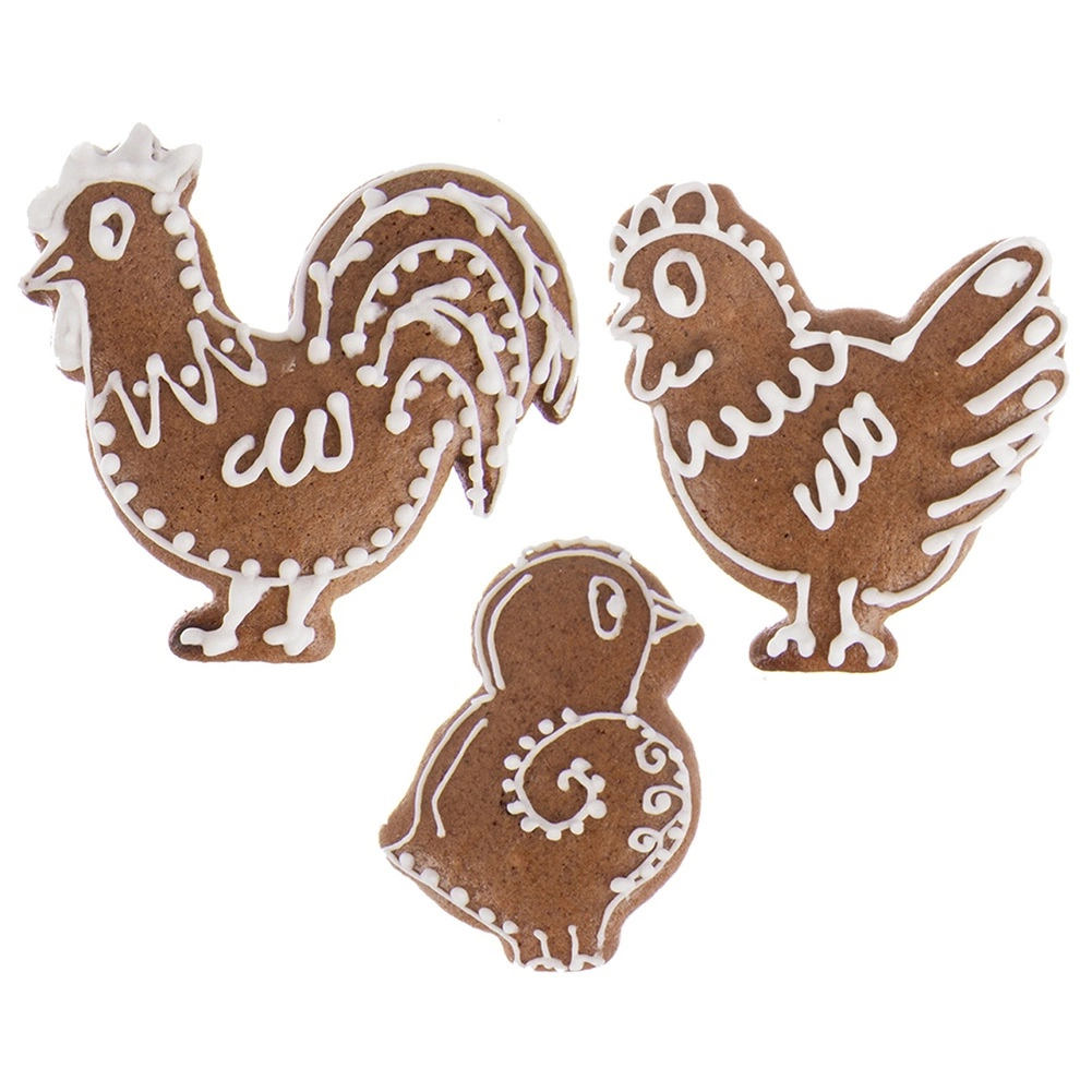 Cocoșul, găina și puiul creează un set adorabil de biscuiți și turtă dulce. Ideal pentru copt festiv și pentru activități creative cu copiii.