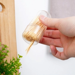 Recipientul transparent cu capac și orificiu de distribuire permite extragerea rapidă și igienică a scobitorilor, fără atingerea inutilă a celorlalte.