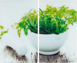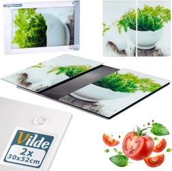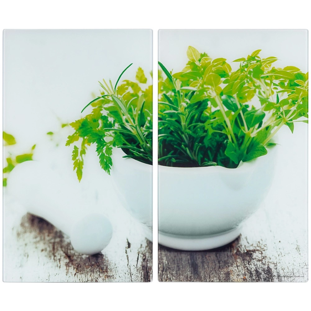 Set practic în două piese din sticlă securizată, sigură pentru sănătate, care extinde spațiul de lucru și protejează în același timp plita împotriva deteriorării. Fiecare placă are dimensiunile 52 × 30 × 0,4 cm, iar împreună creează o suprafață de lucru de aproximativ 60 × 52 cm. Suprafața lucioasă cu motiv de ierburi proaspete adaugă stil bucătăriei și este neporoasă – nu absoarbe mirosurile sau lichidele.