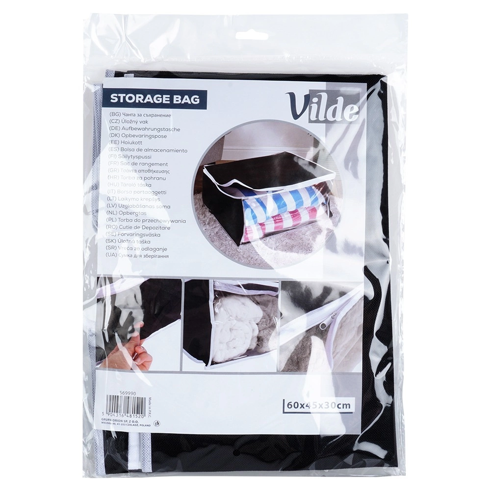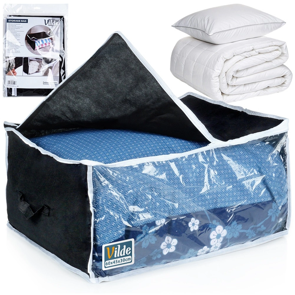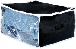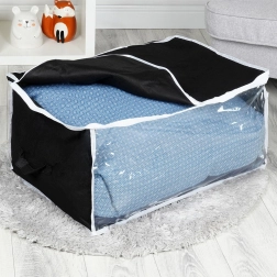 Descoperiți o soluție inteligentă pentru organizarea casei. Acest sac de depozitare din țesătură de poliester rezistentă, de culoare neagră, are mânere laterale solide, fereastră transparentă pentru verificarea imediată a conținutului și fermoar dublu pentru închidere facilă și etanșă. Ideal pentru textile de sezon, lenjerie de pat și haine voluminoase.