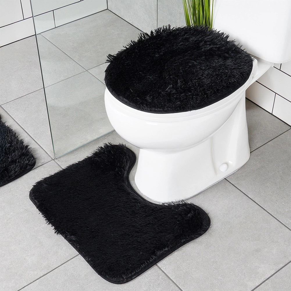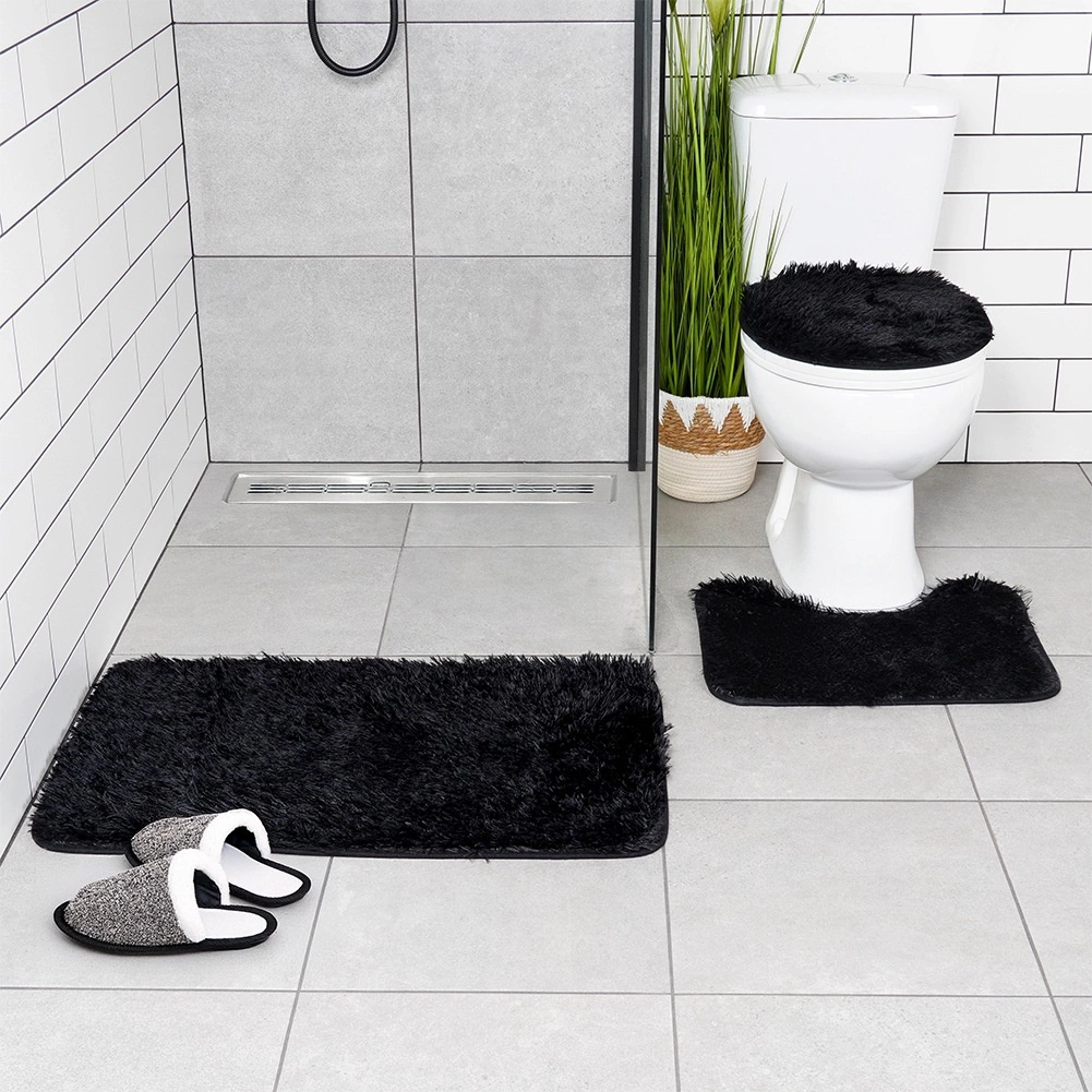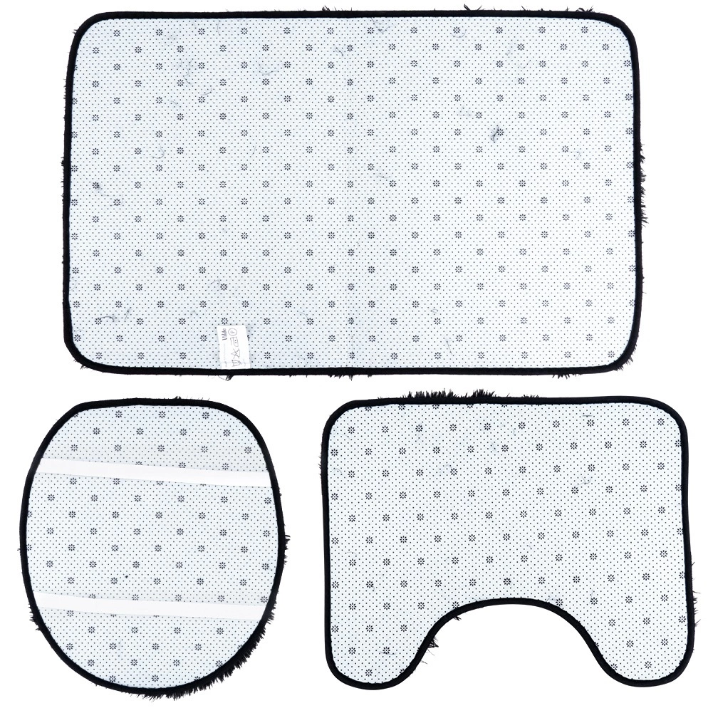 Covoraș dreptunghiular pentru cadă/duș, covoraș în U pentru WC și husă pentru capacul toaletei cu elastice pentru fixare stabilă.