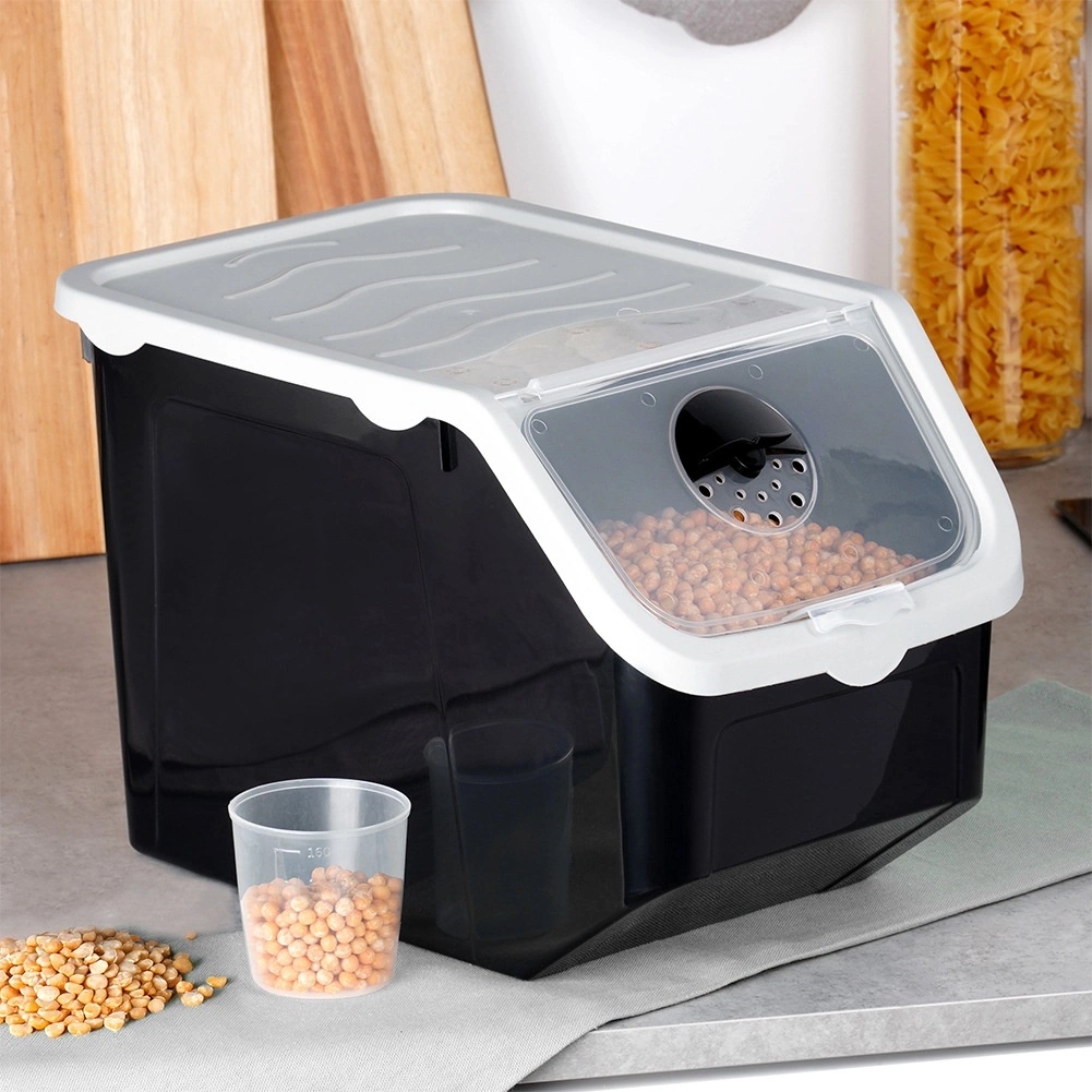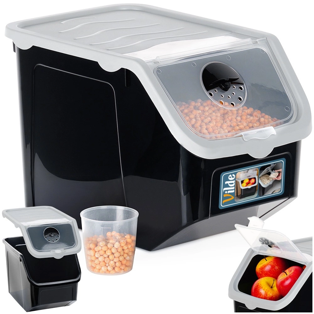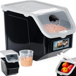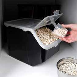Cutia este din plastic de calitate, negru cu capak gri, potrivită pentru contact cu alimentele, rezistă la temperaturi de la -20 °C la 100 °C, poate fi pusă în congelator și în mașina de spălat vase. Este excelentă și pentru leguminoase, orez, paste, hrană pentru animale de companie sau detergenți. Include o cănă gradată practică pentru dozare precisă.