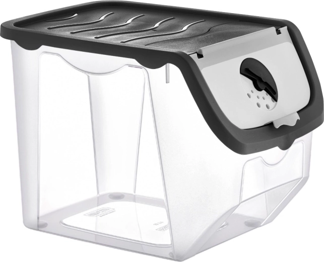 Această cutie multifuncțională (30 × 23,5 × 23,5 cm) facilitează depozitarea și menține ordinea în bucătărie și cămară. Designul transparent permite o verificare vizuală rapidă a proviziilor, iar capacul rabatabil cu clapetă cu clips asigură o completare și o preluare comode a conținutului. Datorită ventilației reglabile, fructele și legumele rămân proaspete mai mult timp.