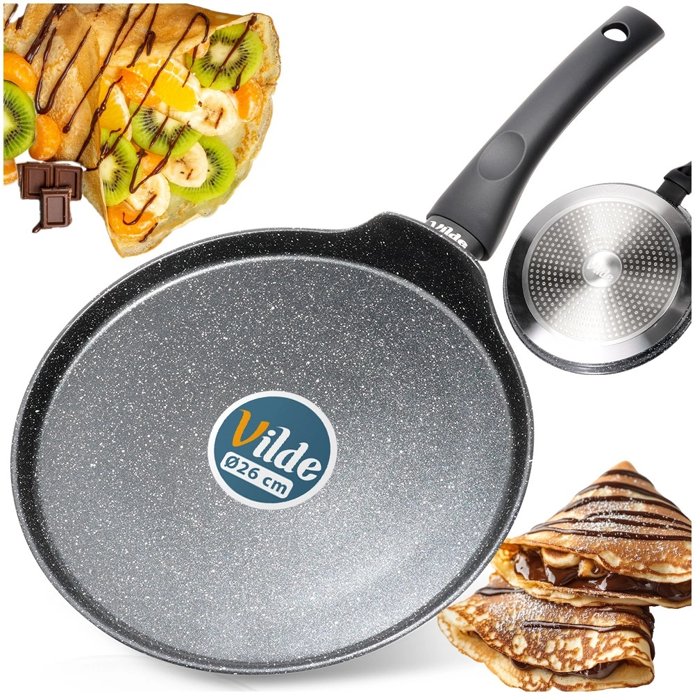 Stratul special din granit previne lipirea și permite prăjirea cu o cantitate minimă de ulei. Clătitele alunecă ușor din tigaie pe farfurie.