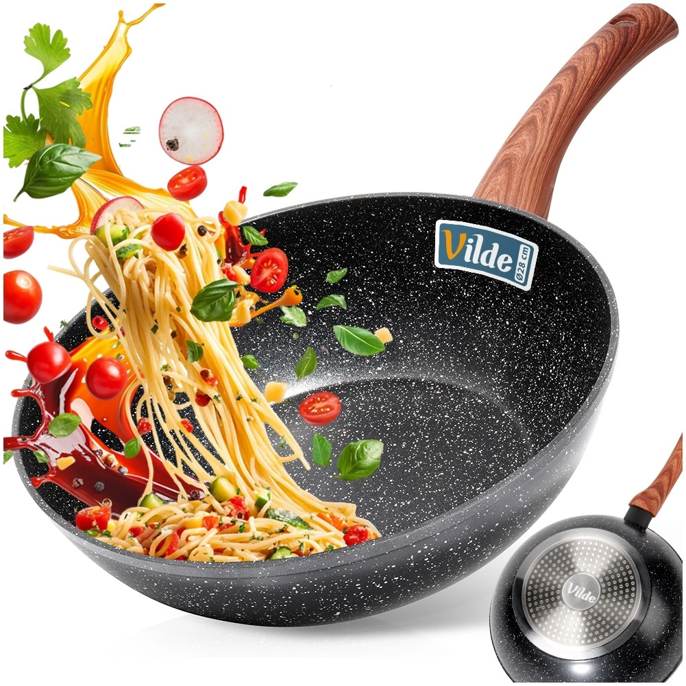 Descoperă wokul practic din granit în eleganta combinație de negru și lemn din colecția VILDE Black&Wood. Corpul adânc, rotunjit, permite sotarea, amestecarea și aruncarea ingredientelor deasupra flăcării cu ușurință, în timp ce suprafața din granit antiaderentă asigură eliberarea facilă a preparatelor și curățarea rapidă.