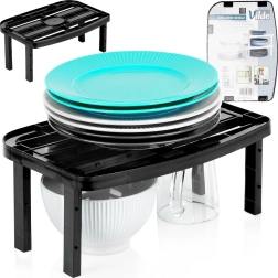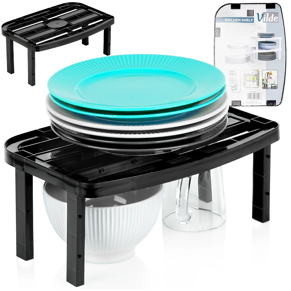 Raft de bucătărie practic, în eleganta culoare neagră, care ajută la maximizarea spațiului de depozitare în dulapuri și pe blatul de lucru. Datorită picioarelor interschimbabile în două lungimi, setați ușor înălțimea la 14,5 cm sau 11,5 cm. Ideal pentru organizarea farfuriilor, cănilor, condimentelor și recipientelor; structura stabilă și durabilă permite și stivuirea mai multor rafturi pentru o organizare și mai bună.