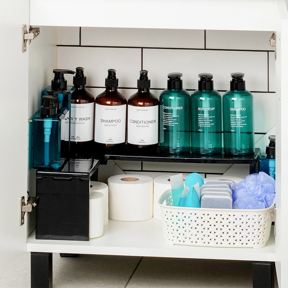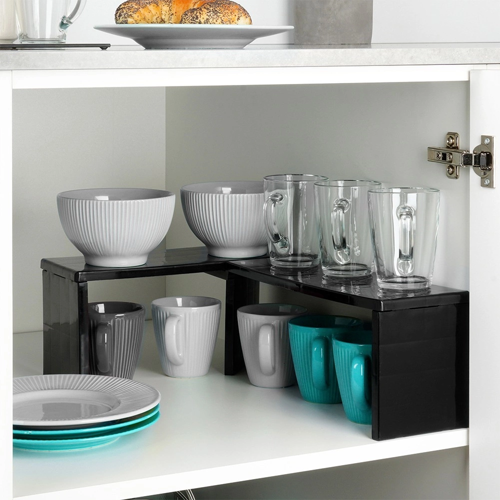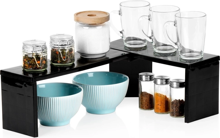 Raftul practic de bucătărie pentru colț, din plastic rezistent, ajută la menținerea ordinii și la utilizarea mai eficientă a spațiului pe blat și în dulapuri. Poate fi folosit în variantă de colț sau aliniată, creând două niveluri de depozitare pentru borcănașe de condimente, căni, boluri sau cutii. Structura stabilă, în elegantul negru, se potrivește în bucătărie, cămară, baie și birou.