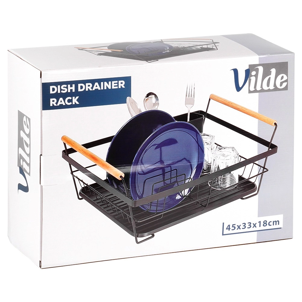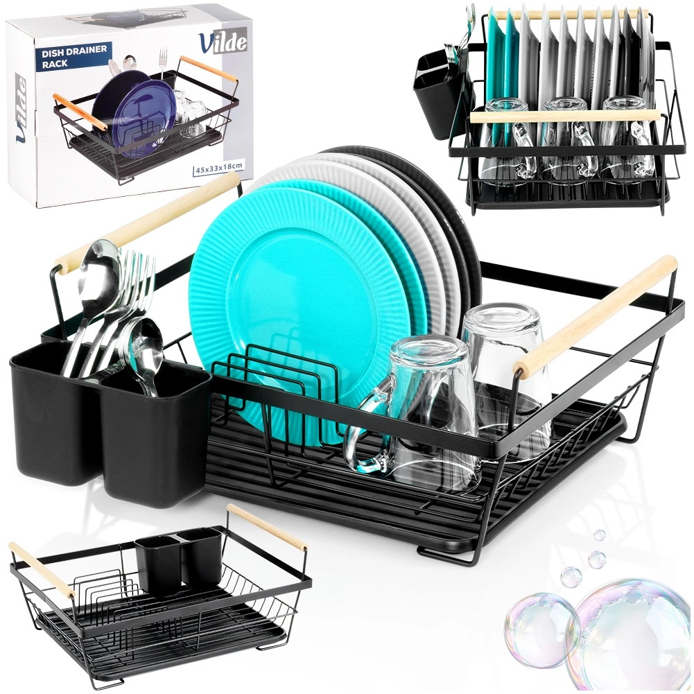 Elegantul suport de uscare pentru vase, în negru, îmbină o construcție solidă din metal cu organizare practică pentru farfurii, pahare și tacâmuri. Tăvița de scurgere detașabilă colectează fiabil apa și menține blatul de bucătărie fără urme umede. Două mânere din lemn permit transportul facil, iar designul atemporal se potrivește atât bucătăriilor moderne, cât și celor clasice.