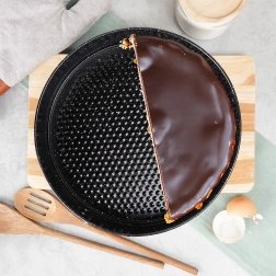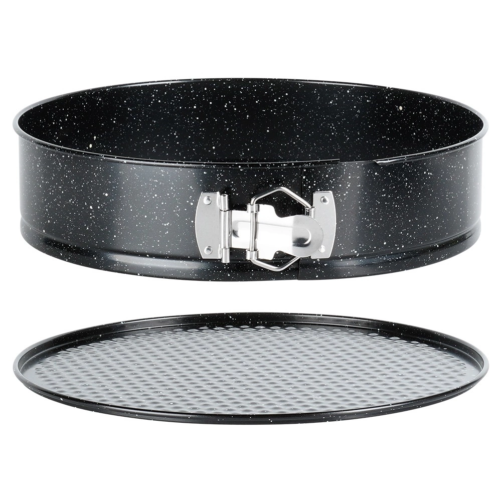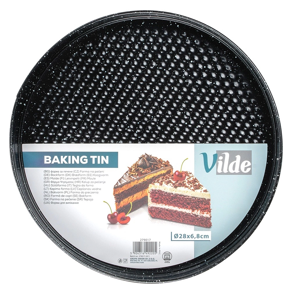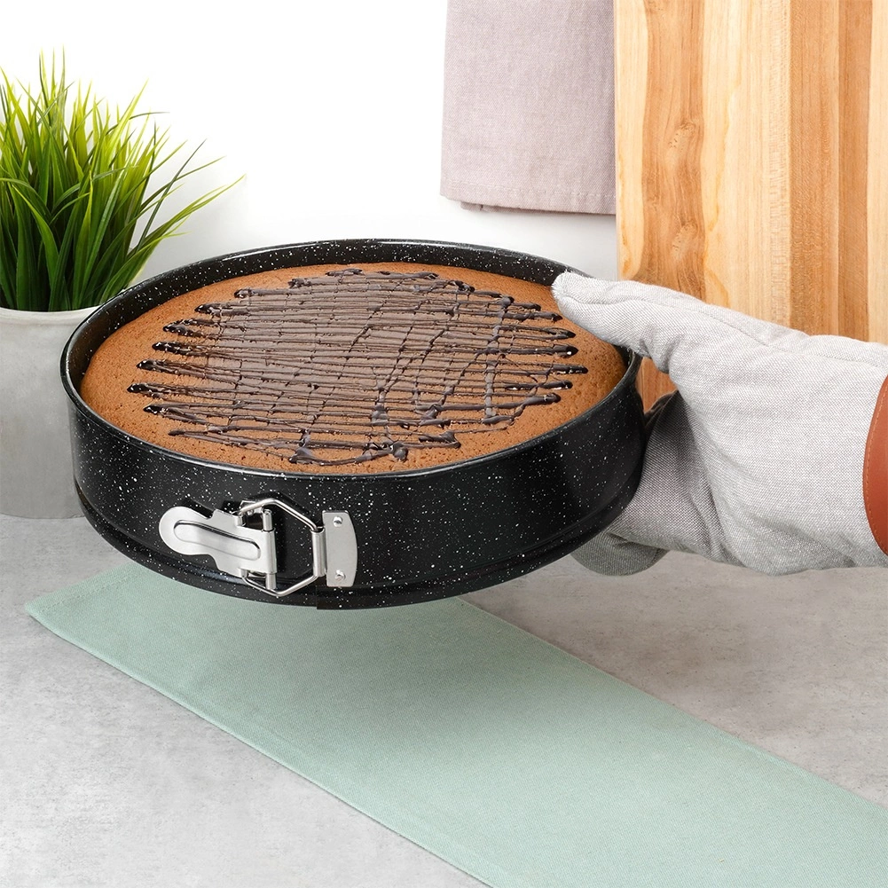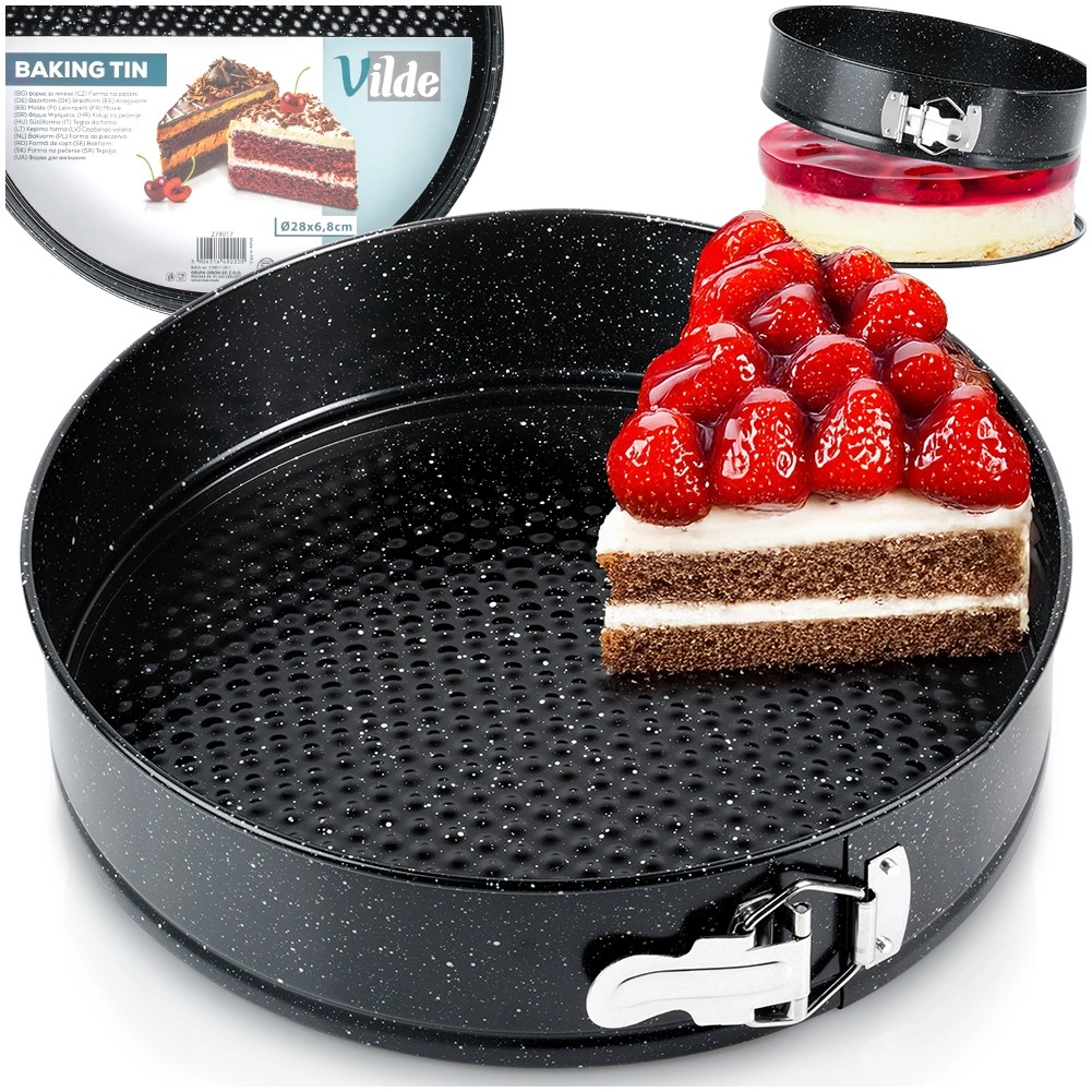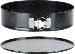 Formă rotundă practică pentru tort, cu diametrul de 28 cm, cu margine detașabilă și bază detașabilă pentru scoaterea ușoară a blaturilor. Fabricată din oțel carbon cu acoperire antiaderentă tip granit, asigură coacere uniformă până la 230 °C și curățare facilă. Ideală pentru torturi, cheesecake-uri, blaturi pandișpan și preparate gratinate.