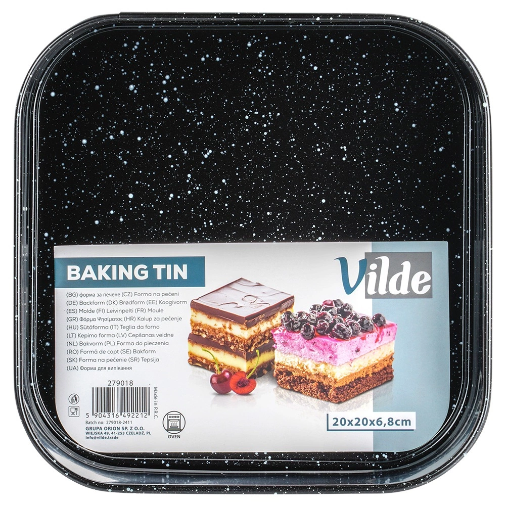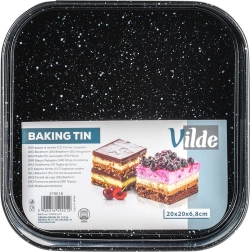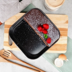 Forma pătrată cu dimensiunile 20 × 20 × 6,8 cm este o alegere excelentă pentru coacerea de zi cu zi. Oțelul carbon robust asigură stabilitate și distribuție uniformă a căldurii, iar suprafața tip granit reduce aderența chiar și la utilizarea unei cantități mici de grăsime. Datorită inelului detașabil și bazei amovibile, scoateți desertul finit fără a-i deforma forma.
