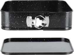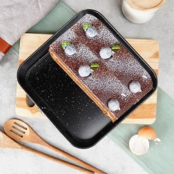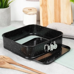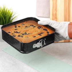 Forma pătrată cu inel detașabil, cu dimensiunile 24 × 24 × 6,8 cm, este o alegere fiabilă pentru coptul zilnic. Datorită pereților detașabili și bazei amovibile, scoți aluatul copt fără a-i deforma forma și cu efort minim. Stratul antiaderent tip granit reduce necesarul de grăsime și ușurează curățarea.