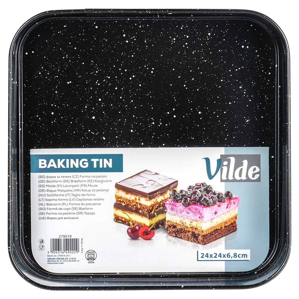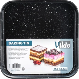 Oțelul carbon masiv asigură distribuția uniformă a căldurii, este rezistent la temperaturi înalte (până la 230 °C) și nu absoarbe mirosuri sau lichide. Forma este potrivită pentru cuptoare pe gaz și electrice și, datorită formei pătrate, este excelentă pentru tarte, prăjituri feliate, cheesecake, blaturi de tort și preparate sărate gratin.