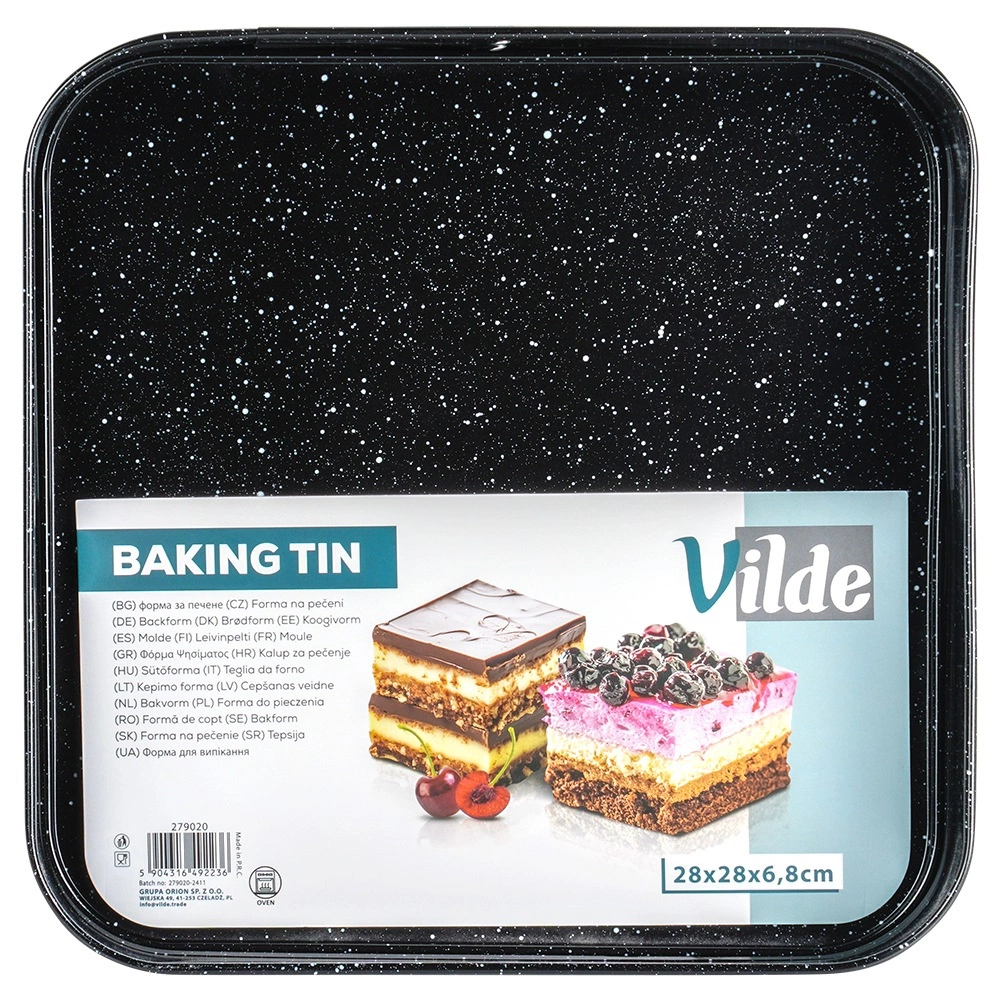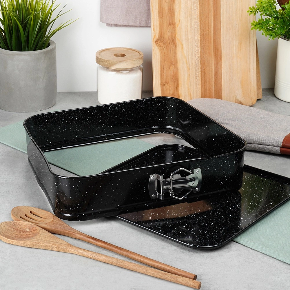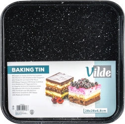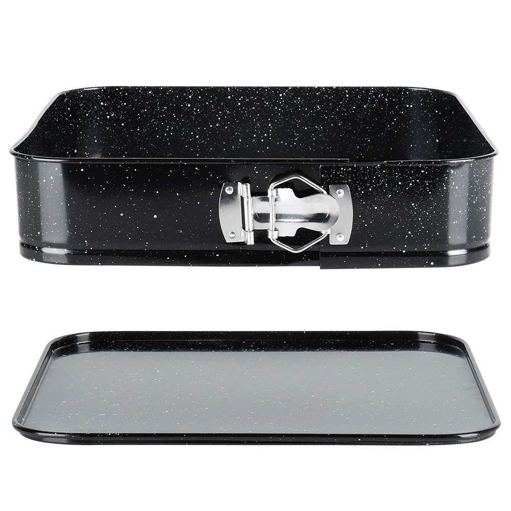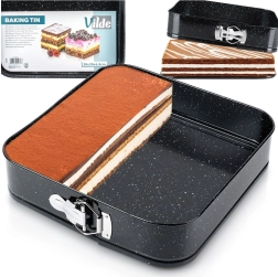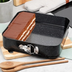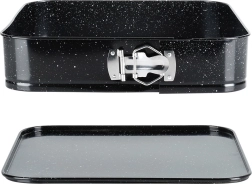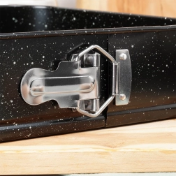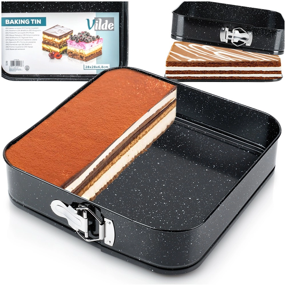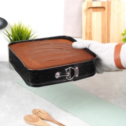 Această formă pătrată cu inel detașabil, 28 × 28 × 6,8 cm, este o alegere excelentă pentru coacerea zilnică. Corpul din oțel carbon de calitate, cu strat de suprafață granit, asigură distribuție termică foarte bună și reduce arderea. Forma se deschide ușor cu ajutorul clemei laterale, iar datorită fundului detașabil scoateți blatul finit fără a-i deteriora forma.