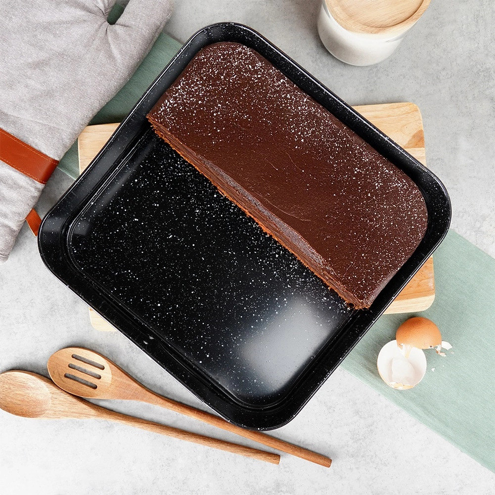 Suprafața granitată cu pistrui reduce arderea și ușurează curățarea. Coaceți cu mai puțină grăsime și obțineți margini curate.