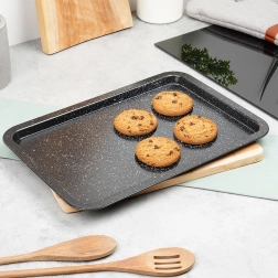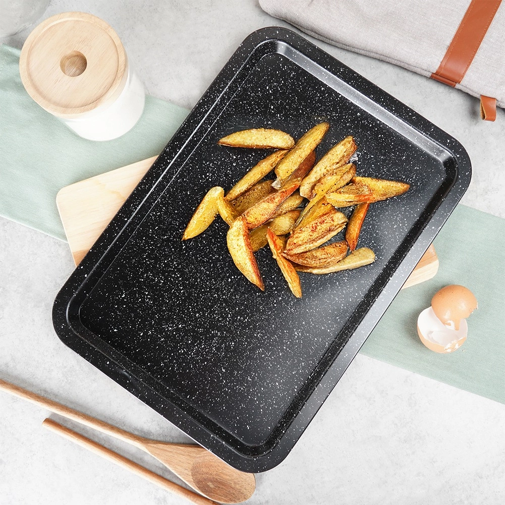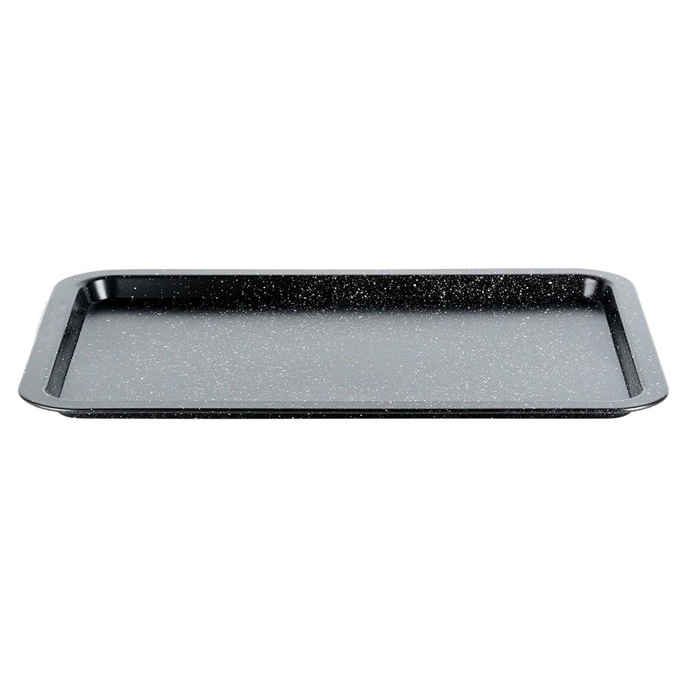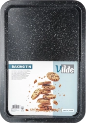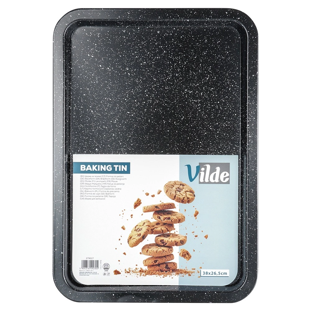 Tava practică de copt din granit Vilde, cu dimensiunile 38 × 26,5 × 1,5 cm, asigură coacere uniformă, suprafață antiaderentă și curățare ușoară. Ideală pentru carne, legume, biscuiți, cartofi prăjiți și pizza de casă cu blat mai gros.
