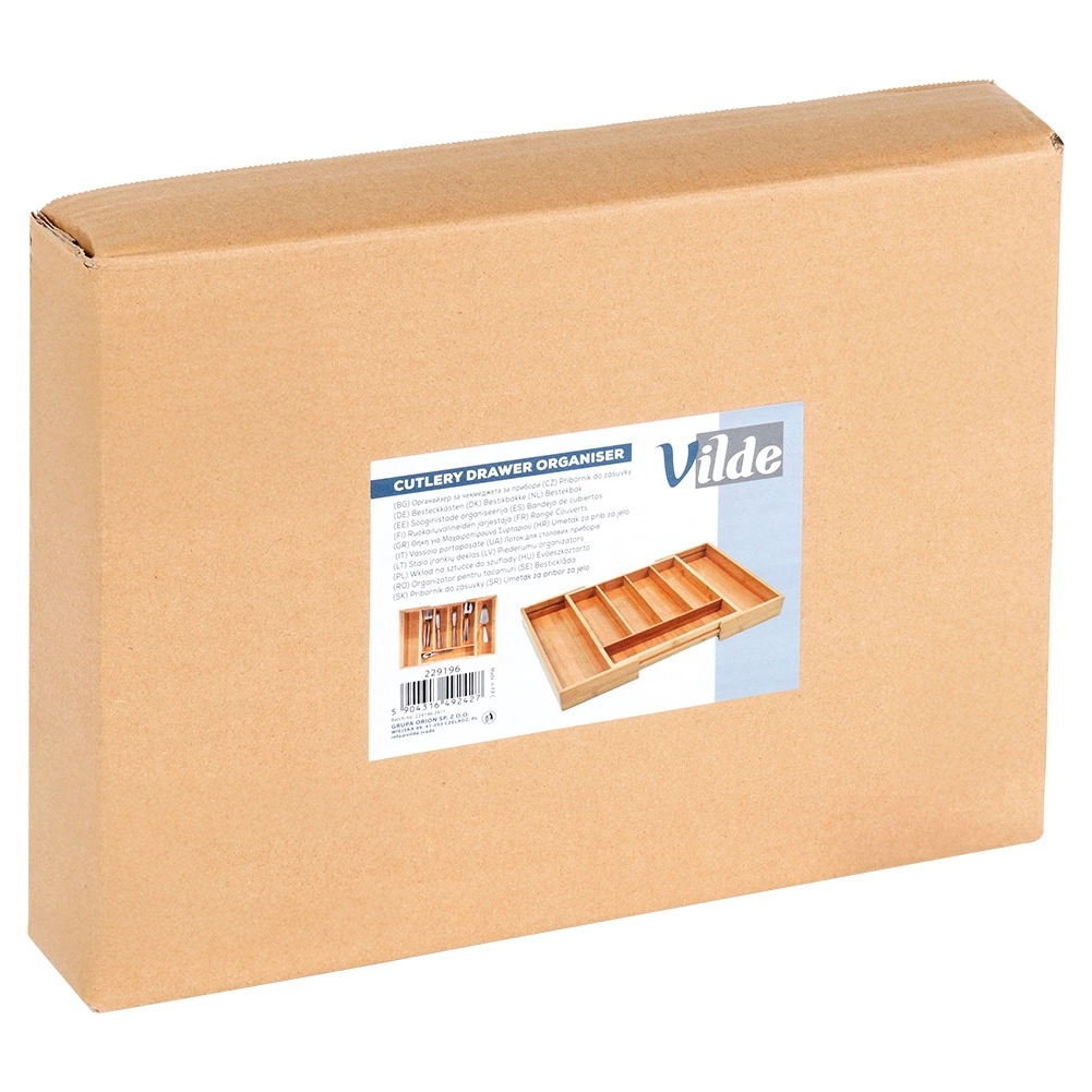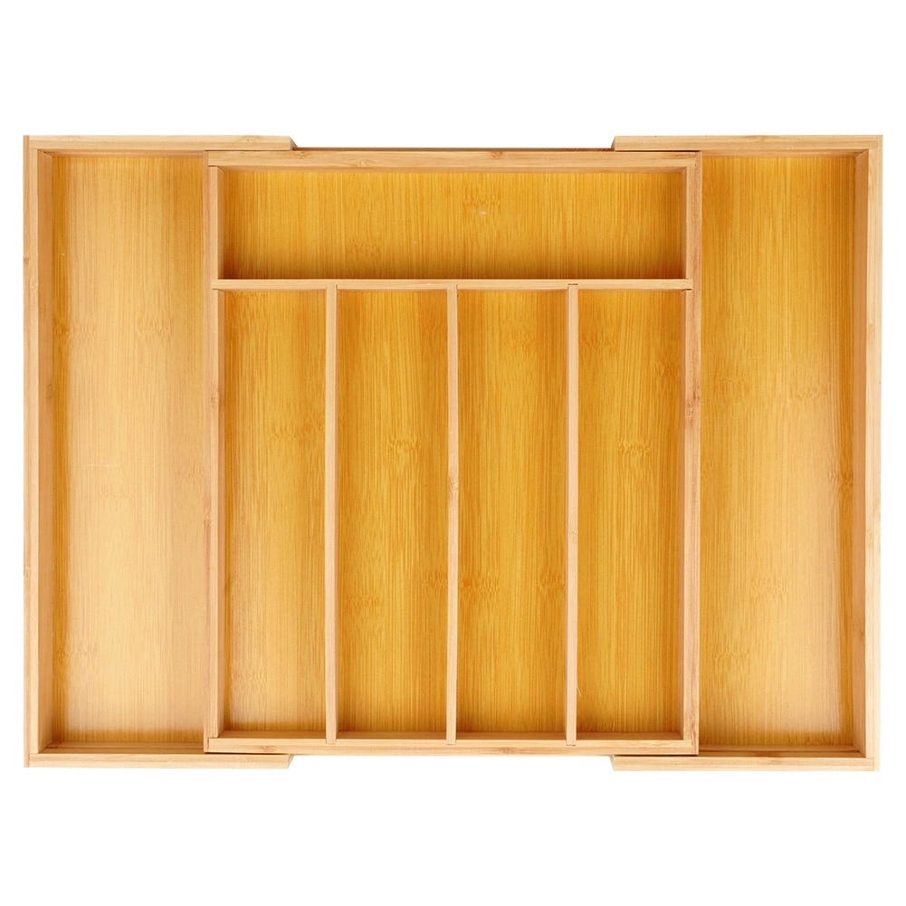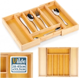 Organizează sertarul o dată pentru totdeauna. Organizatorul extensibil din bambus pentru tacâmuri se ajustează ușor la lățimea sertarului tău, de la 28 la 45 cm, astfel încât se potrivește perfect în diferite tipuri de mobilier de bucătărie. Construcția solidă din bambus natural este rezistentă, igienică și ușor de curățat.