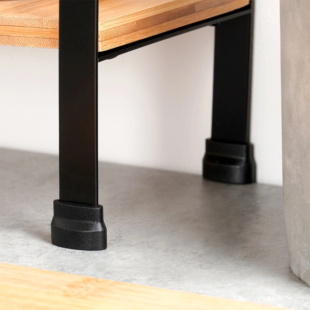 Etajera de colț, elegantă și practică, te ajută să folosești la maximum spațiul de pe blatul de bucătărie și din interiorul dulapurilor. Construcția în formă de L se potrivește perfect în colț, în timp ce cele două niveluri permit depozitarea ordonată a condimentelor, paharelor și accesoriilor mici. Combinația de bambus natural și metal negru oferă bucătăriei un aspect modern.