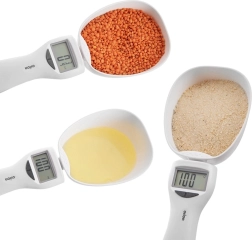 Lingură de bucătărie digitală cu cântar pentru măsurarea precisă a ingredientelor solide și lichide direct la preluare. Capacitate max. 1 kg, volum 270 ml, ecran LCD clar, măsurare în g/ml/oz/fl oz/cup, funcție TARE și oprire automată. Ușoară, compactă și ideală pentru copt, gătit și porționarea hranei pentru animale de companie.