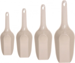 Set practic de patru lopeți în dimensiuni diferite pentru a lua și transfera ușor ingrediente vrac acasă sau în gastronomie. Realizate din plastic rezistent, în culoare bej, cu mânere confortabile prevăzute cu orificiu pentru agățare și posibilitate de spălare în mașina de spălat vase. Utilizare versatilă pentru făină, zahăr, cafea, fulgi, griș, gheață sau hrană pentru animale de companie. Suprafață netedă pentru curățare facilă și depozitare economă, stivuibilă.