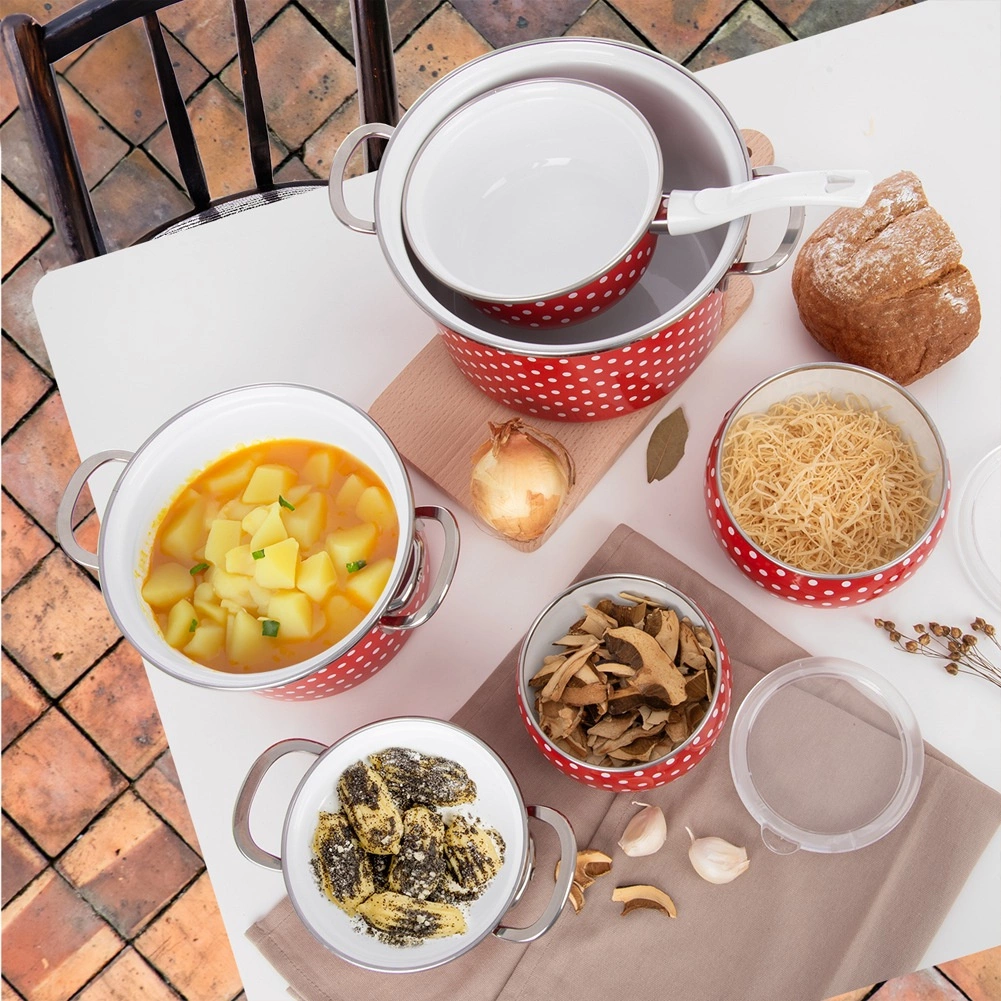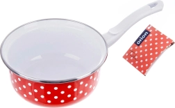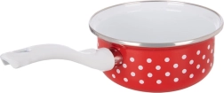 O cratiță elegantă în stil retro, cu email roșu și buline albe, care va înfrumuseța bucătăria și va oferi, totodată, utilitate practică în fiecare zi. Datorită mânerului lung, se ține confortabil și permite turnarea ușoară. Emailul este sigur pentru sănătate și potrivit chiar și pentru alergici.