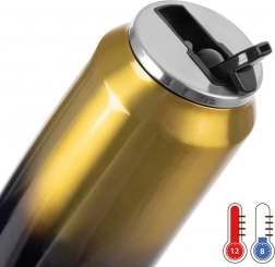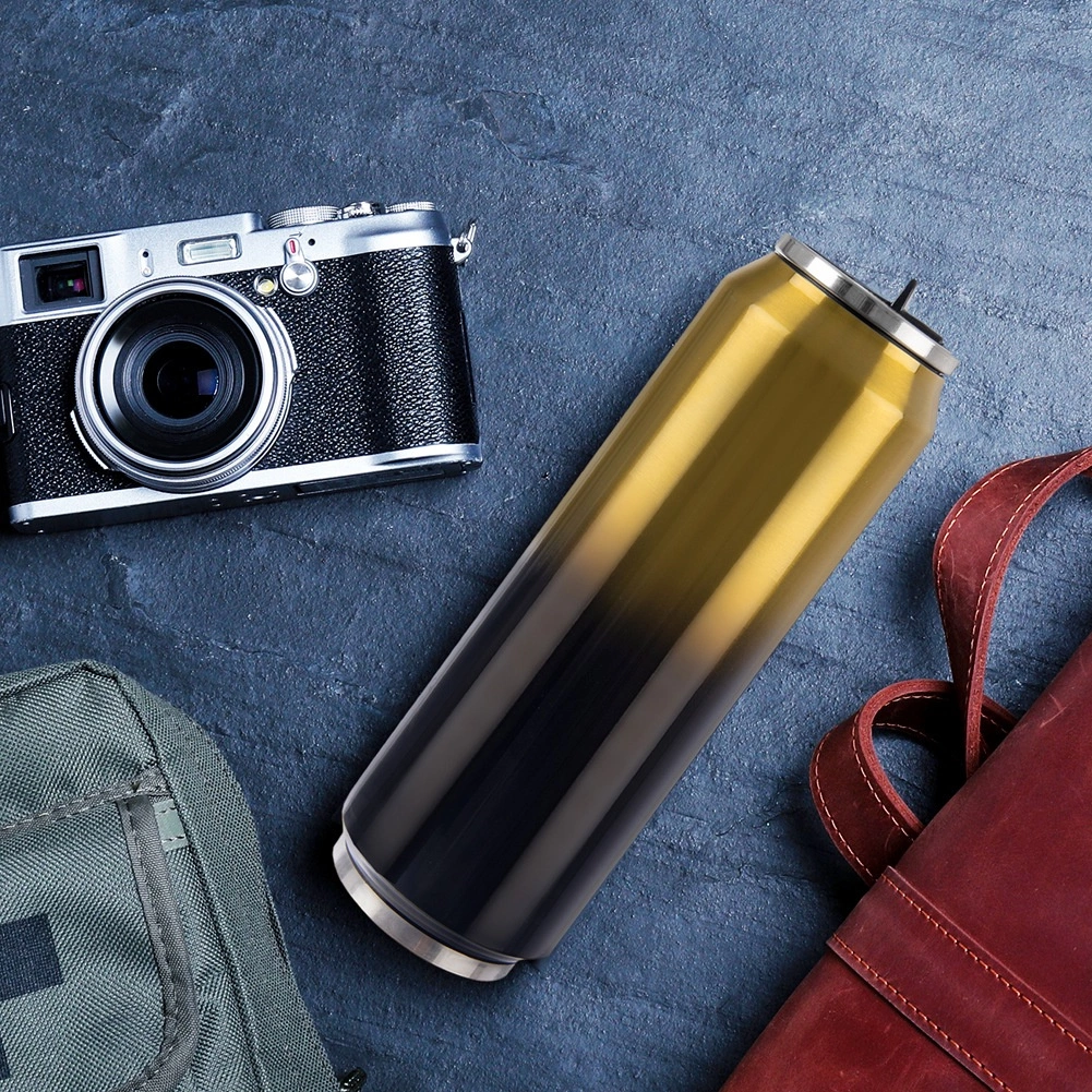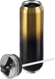 Termosul elegant în degrade negru‑auriu îmbină designul modern cu funcționalitatea. Este realizat din oțel inoxidabil durabil cu izolație vidată, care menține în mod fiabil temperatura băuturii pe tot parcursul zilei. Capacul cu muștiuc rabatabil și inel de etanșare împiedică scurgerile, astfel încât îl poți pune fără griji în rucsac sau geantă.