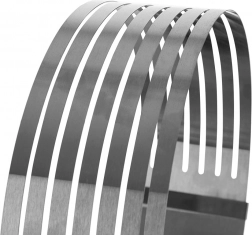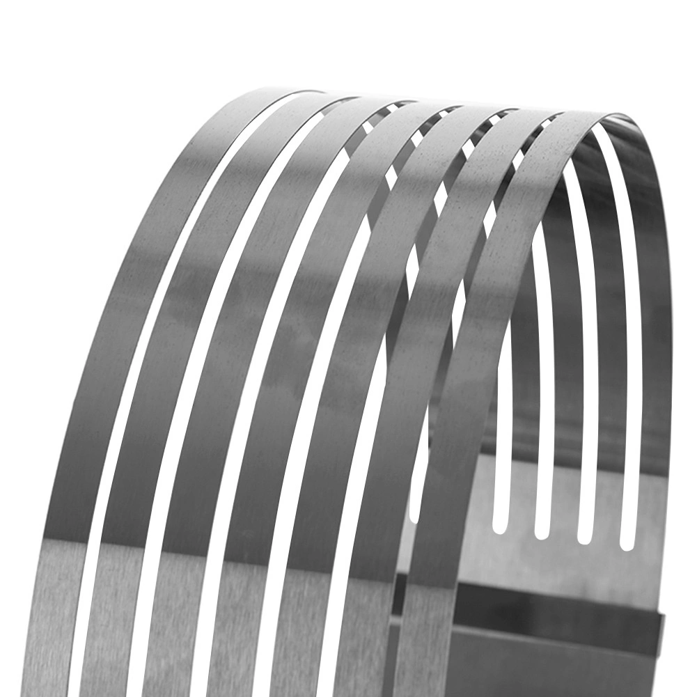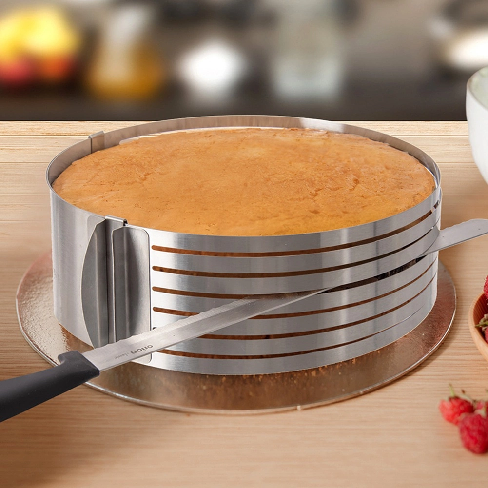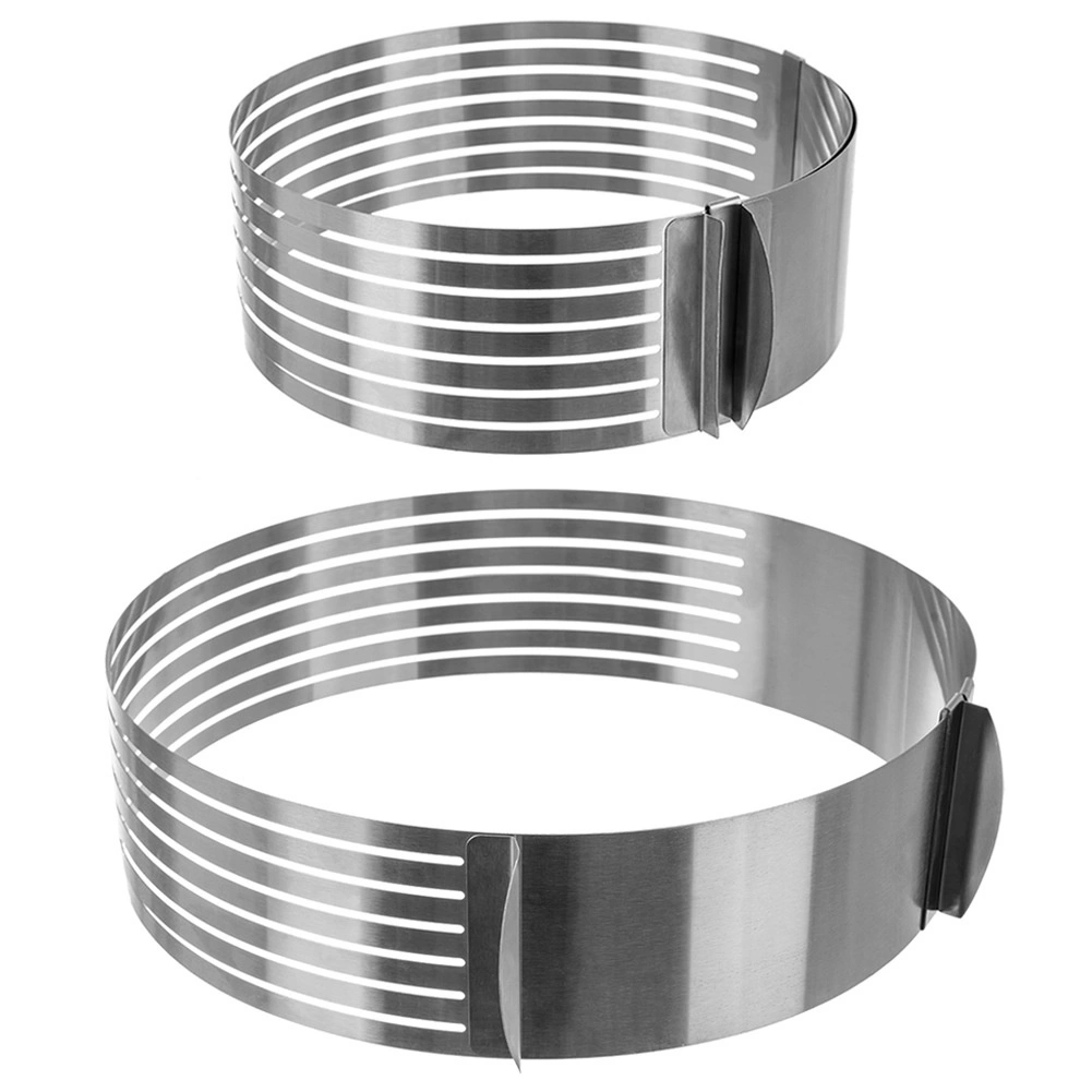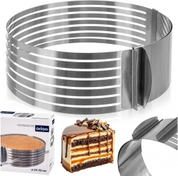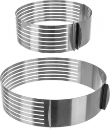 Inelul din inox pentru felierea blatului este un ajutor ideal pentru pasionații de cofetărie care doresc să obțină straturi perfect drepte fără măsurători complicate. Clema ajustabilă permite adaptarea exactă a diametrului între 24 și 30 cm, iar canelurile de ghidare ajută la menținerea cuțitului pe aceeași linie.