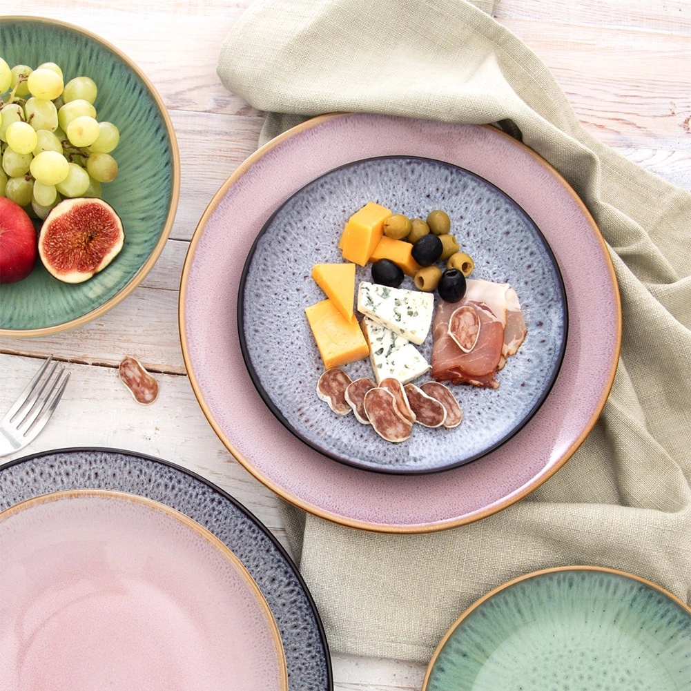 Glazura reactivă, fin punctată, oferă farfuriei un aspect original, iar fiecare piesă arată unic pe masa aranjată.