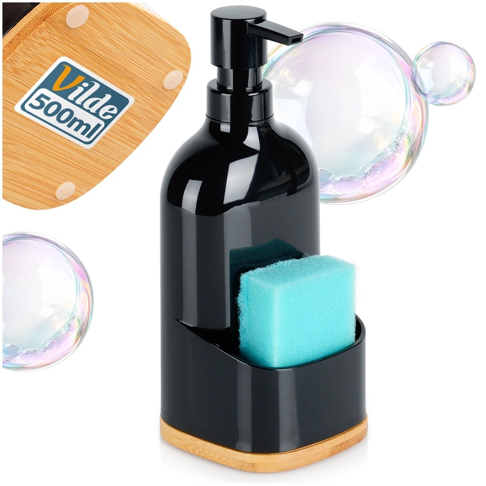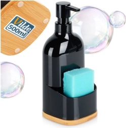 Dozator practic pentru spălat vase cu spațiu de depozitare frontal pentru burete sau lavetă, astfel încât să aveți totul la îndemână. Plasticul de calitate în culoare negru mat și baza din bambus adaugă un accent natural și un aspect modern bucătăriei. Datorită capacității de 500 ml, nu trebuie reumplut prea des.