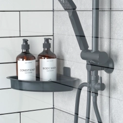 Forma triunghiulară utilizează eficient colțul dușului și păstrează cosmeticele la îndemână fără să incomodeze.