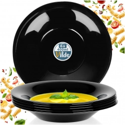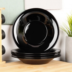 Set elegant de 6 farfurii adânci din sticlă opalină, de culoare neagră, ideal pentru mesele de zi cu zi și ocazii festive. Fiecare farfurie are diametrul de 21,5 cm și volumul de 400 ml, perfectă pentru supe, paste sau salate. Materialul este rezistent la temperaturi de până la +100 °C, se poate spăla în mașina de spălat vase și utiliza în cuptorul cu microunde. Aspect stilat, utilizare versatilă și întreținere ușoară pentru bucătăria ta modernă.