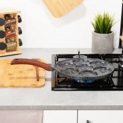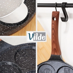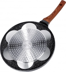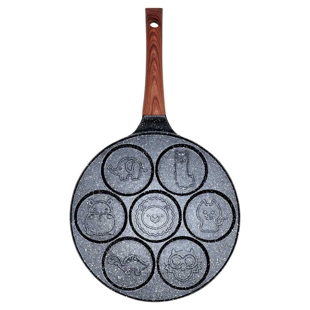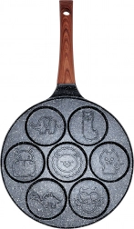Această tigaie stilată din linia BLACK & WOOD este ideală pentru ouă, clătite americane și mini clătite. Cele șapte adâncituri rotunde cu reliefuri jucăușe de animăluțe creează forme frumoase și uniforme și aduc bucurie în fiecare ritual al micului dejun. Construcția durabilă din aluminiu cu strat granit asigură încălzire rapidă și o durată lungă de viață.
