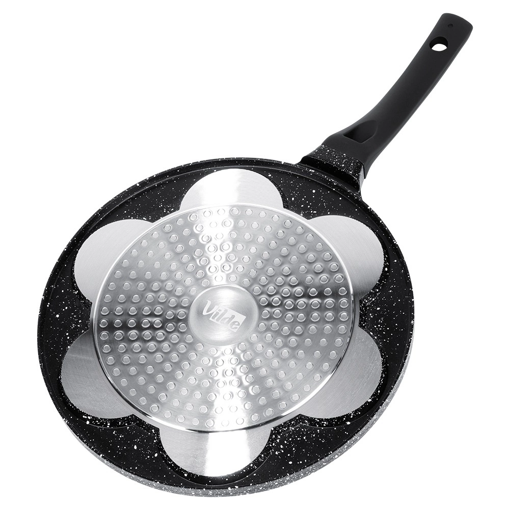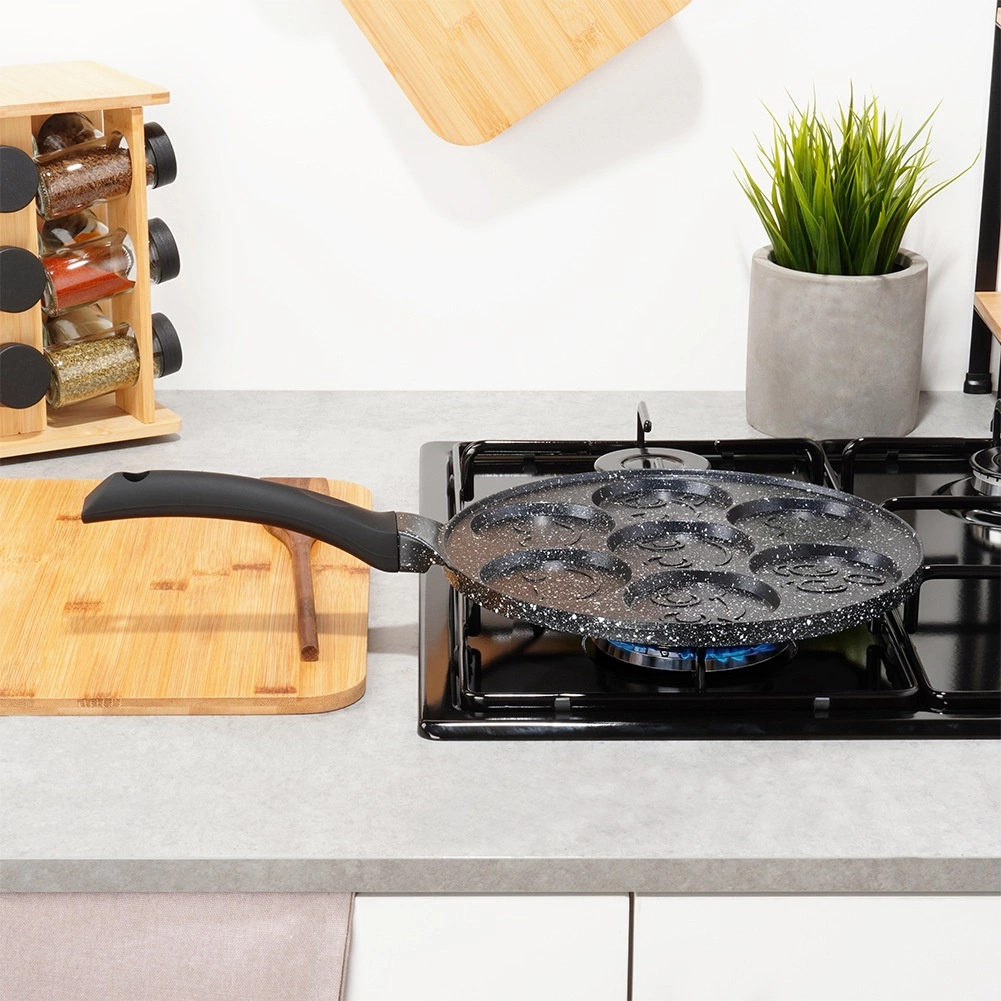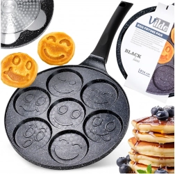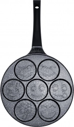Această tigaie stilată din linia BLACK LINE, cu diametrul de 26 cm, aduce bucurie în orice bucătărie. Cele șapte cavități rotunde cu relief de fețe zâmbitoare creează turtițe perfect formate, mini clătite sau ouă ochiuri, îndrăgite de copii și adulți. Corpul din aluminiu cu suprafață antiaderentă din granit reduce arderea și permite o preparare mai sănătoasă cu minimum de grăsime.