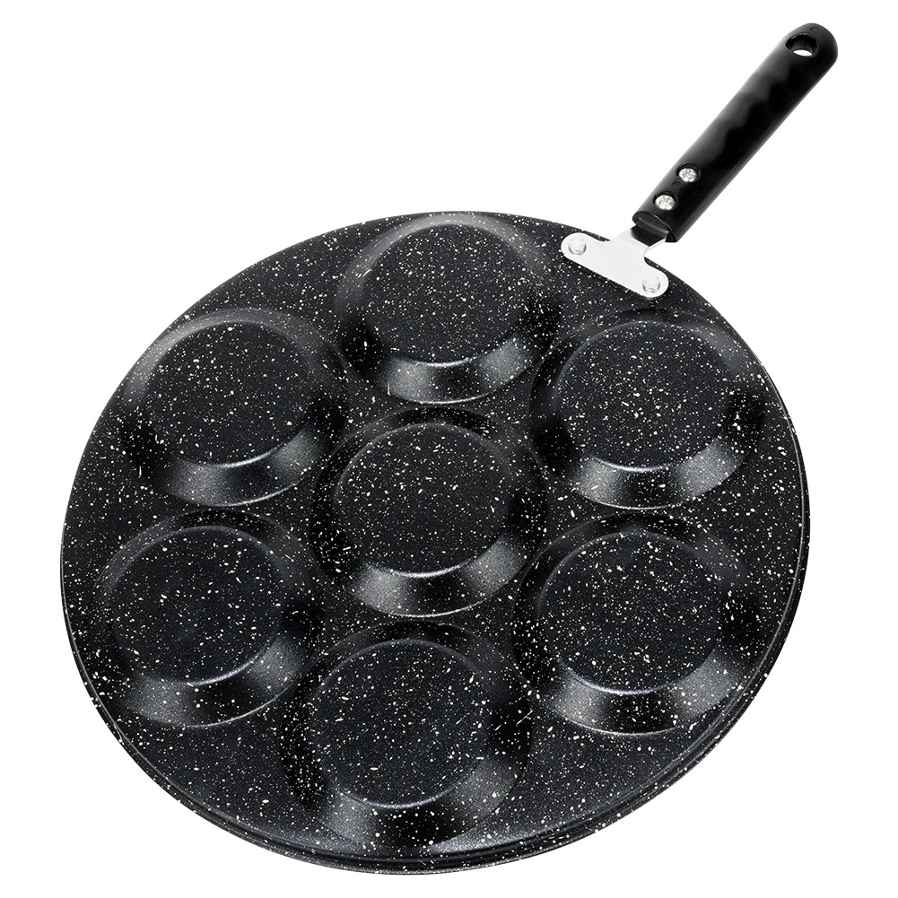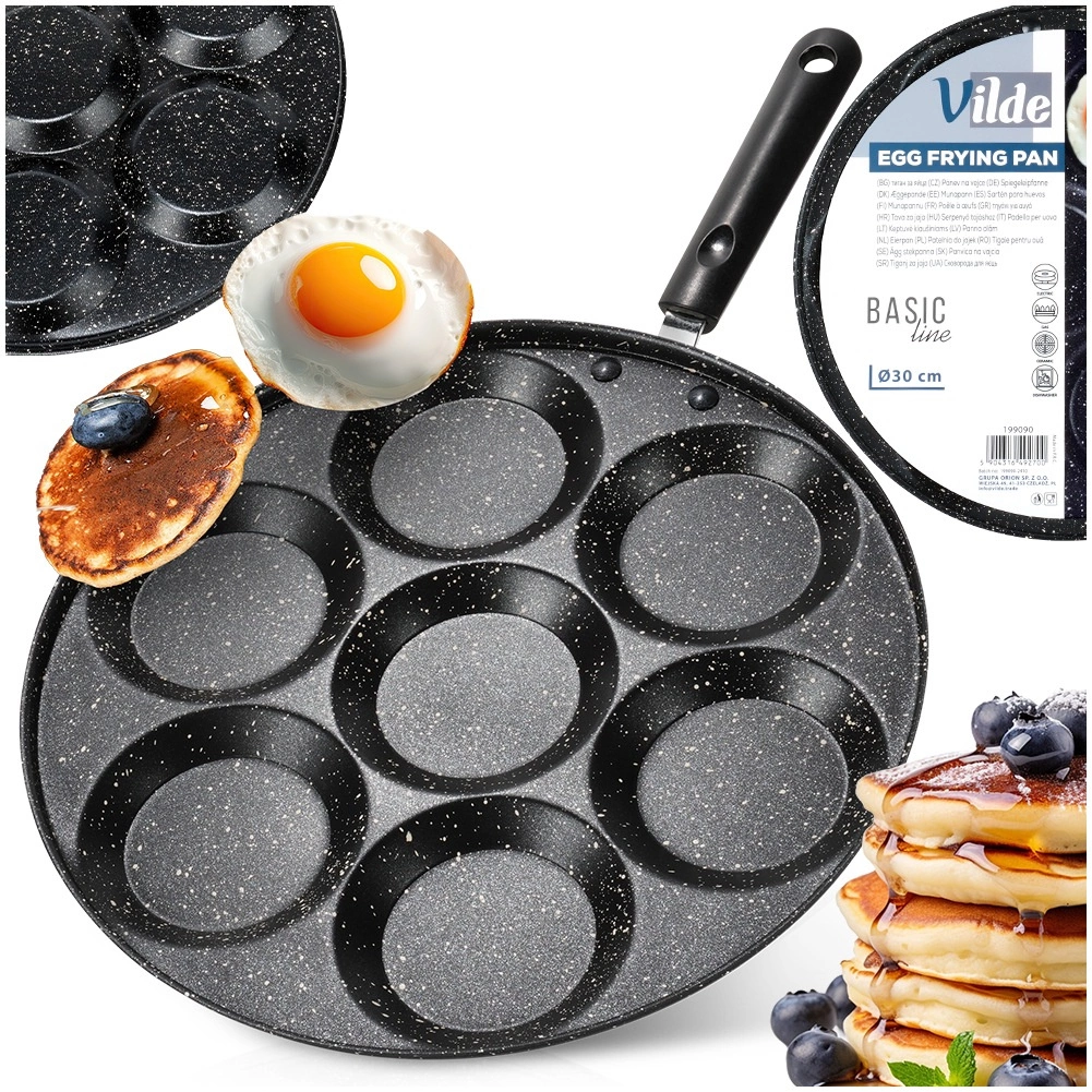Descoperă tigaia versatilă pentru o pregătire rapidă și comodă a micului dejun. Șapte forme separate cu diametrul de 9 cm creează porții uniforme și egale, ideale pentru ouă, pancake-uri mici și poffertjes. Acoperirea antiaderentă de calitate din granit minimizează lipirea și permite gătirea cu mai puțin ulei.