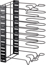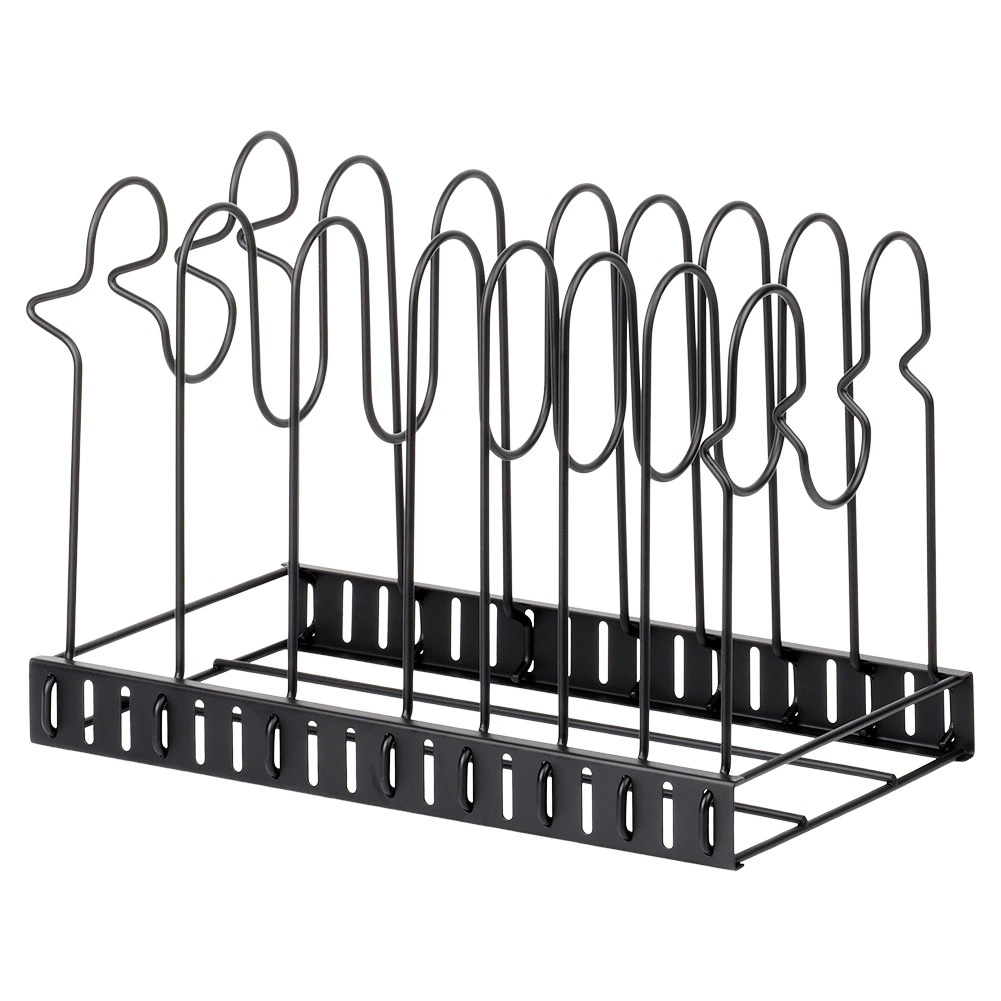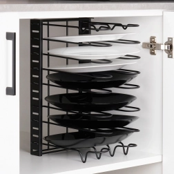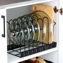 Păstrează capacele, farfuriile și tocătoarele separate și ordonate. Organizatorul economisește spațiu și grăbește accesul la vasele folosite frecvent.