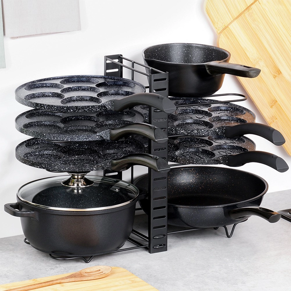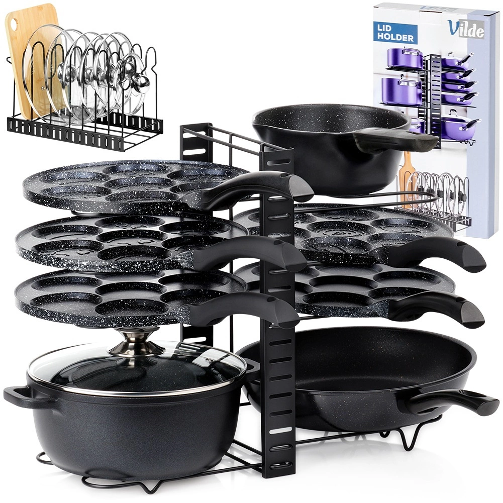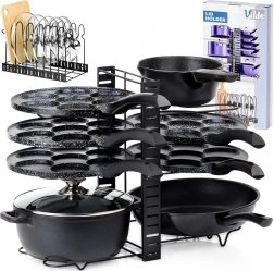 - Organizator de bucătărie 2‑în‑1 pentru oale, tigăi, capace, farfurii și tocătoare