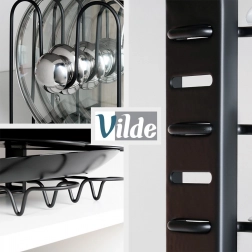 Nivelele polițelor se mută ușor, astfel încât în suport să încapă atât tigăi mici, cât și mari, oale adânci și capace înalte.