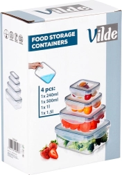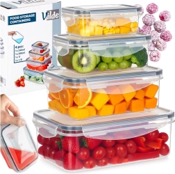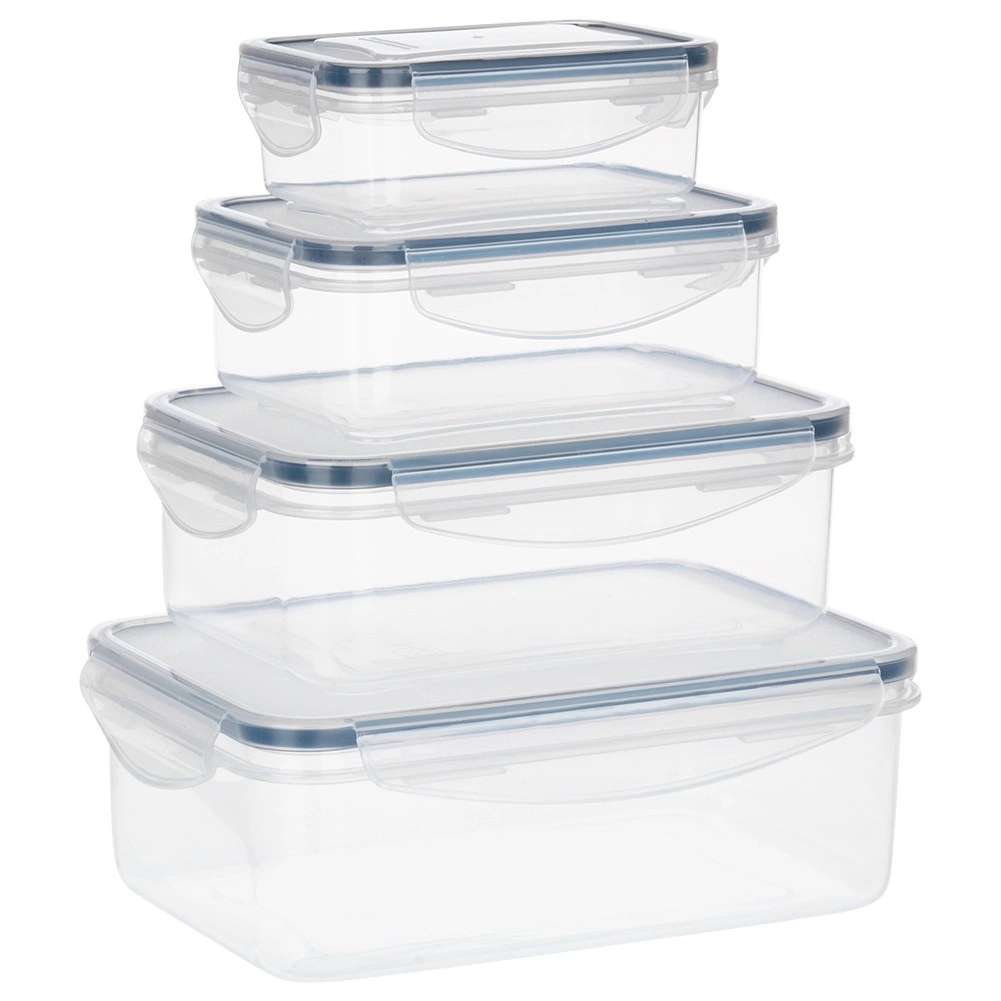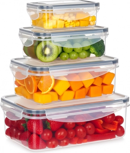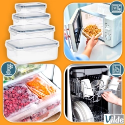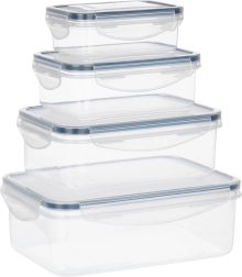 Set practic de patru recipiente transparente cu capace și garnitură de silicon, care păstrează mâncarea mai mult timp proaspătă și depozitată în siguranță. Dimensiuni diferite pentru depozitare și meal prep, etanșare ermetică datorită celor patru cleme, fără BPA și potrivite pentru mașina de spălat vase, cuptorul cu microunde (fără capac) și congelator.