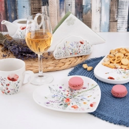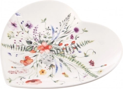 Această farfurie din porțelan în formă de inimă din colecția Maki aduce mesei tale o notă romantică. Smalțul alb cu decor colorat de flori de câmp oferă un aspect proaspăt și elegant, făcând farfuria potrivită atât pentru utilizare zilnică, cât și pentru ocazii festive.