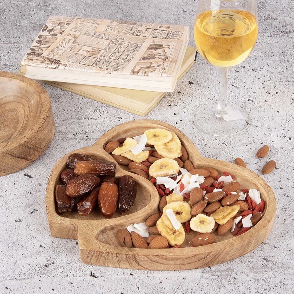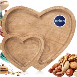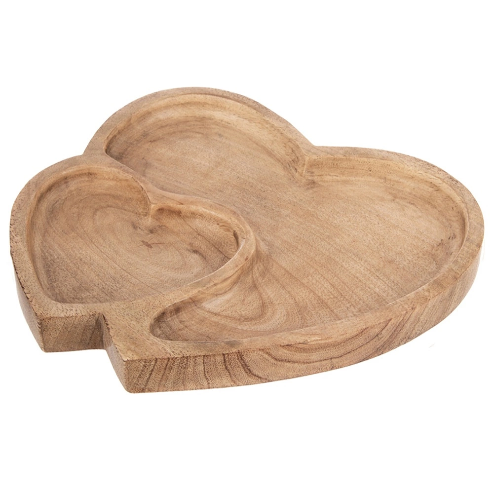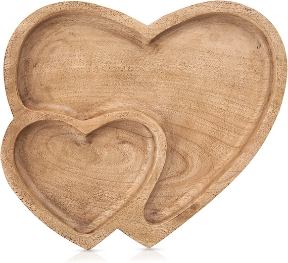 Această tavă de servire din lemn de mango rezistent se remarcă prin forma romantică de inimă dublă și prin împărțirea practică în două zone. Potrivită pentru servirea zilnică sau pentru ocazii festive – de la nuci și fructe uscate până la bomboane și biscuiți. Datorită texturii naturale a lemnului, se potrivește în interioare rustice, boho și scandinave.