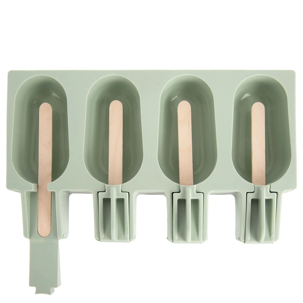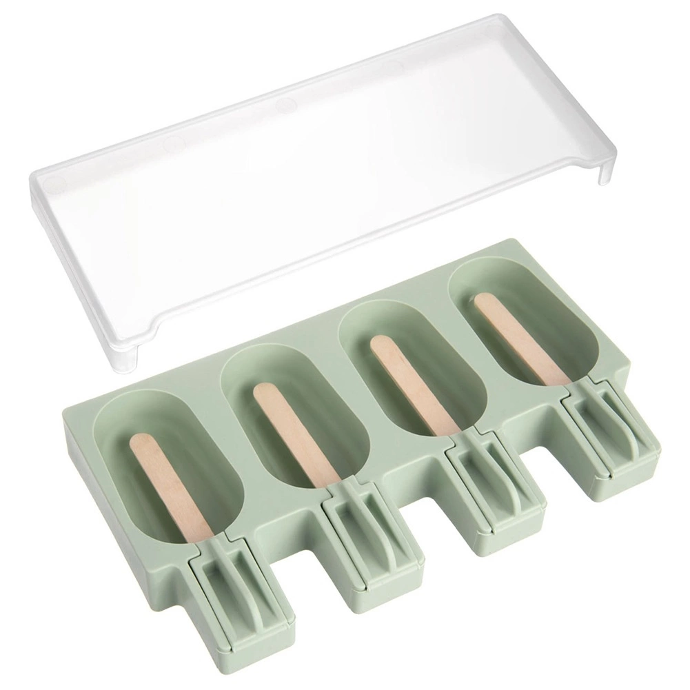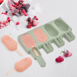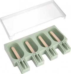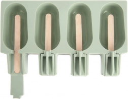 Forma este realizată din silicon de calitate, în culoare verde pastel, iar capacul este transparent. Este potrivită pentru mașina de spălat vase, congelator și cuptor cu microunde și rezistă la temperaturi de la -20 °C la +120 °C. Pachetul include 24 de bețișoare din lemn. Dimensiunea întregii forme este 20 × 11,5 × 2,6 cm, mărimea unei înghețate aprox. 7 × 4 cm.