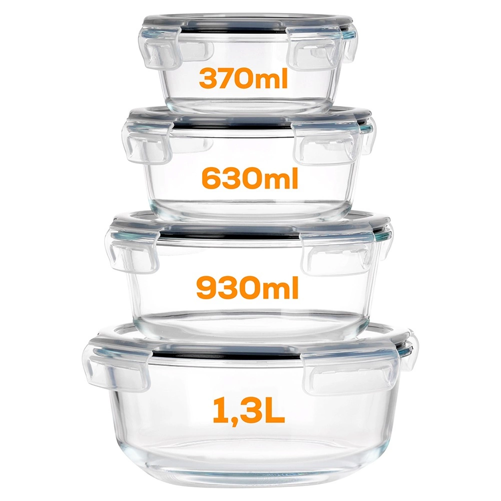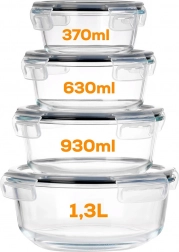 Volumele practice de 370 ml, 630 ml, 930 ml și 1,3 l acoperă nevoile zilnice și permit depozitarea ordonată, economisitoare de spațiu.
